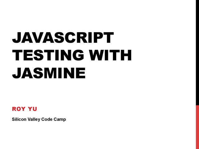This presentation is prepared for SVCC on Javascript Testing with Jasmine. It basically goes through basic Jasmine feature and provide tips for developers when they decide to start testing.