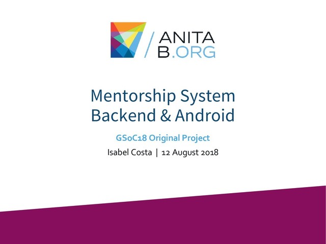 Costa from Portugal Background? • Worked 2 years on Android and I’m a MSc Telecommunications and Informatics Engineering graduate Previous Experience with Open Source? • Almost none before GSoC • 1 PR in November ‘17 HacktoberFest, 1 PR for another org on GSoC and then started in March on Systers Open Source with more than PRs