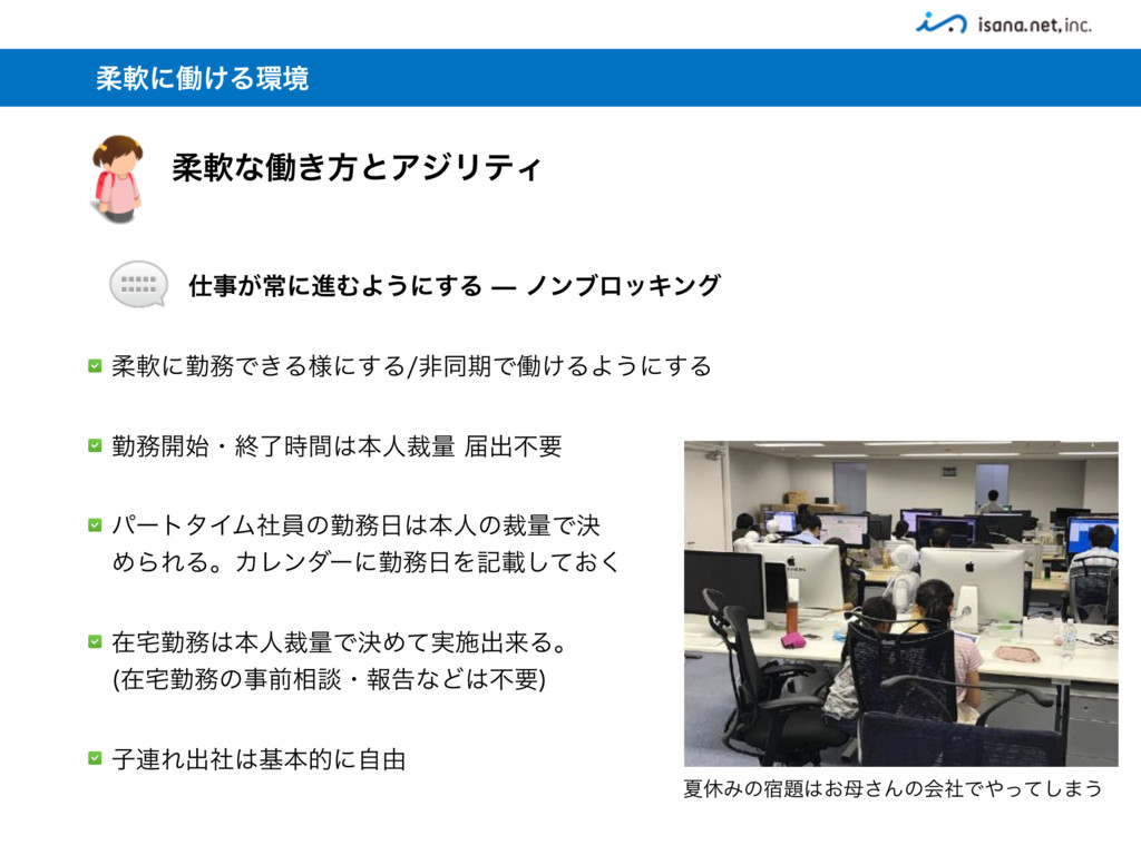 ॊೈͳಇ͖ํͱΞδϦςΟ ࣄ͕ৗʹਐΉΑ͏ʹ͢ΔϊϯϒϩοΩϯά ॊೈʹۈͰ͖Δ༷ʹ͢ΔඇಉظͰಇ͚ΔΑ͏ʹ͢Δ ۈ։࢝ɾऴྃ࣌ؒຊਓࡋྔಧग़ෆཁ ύʔτλΠϜࣾһͷۈຊਓͷࡋྔͰܾ ΊΒΕΔɻΧϨϯμʔʹۈΛهࡌ͓ͯ͘͠ ࡏۈຊਓࡋྔͰܾΊ࣮ͯࢪग़དྷΔɻ ࡏۈͷࣄલ૬ஊɾใࠂͳͲෆཁ ࢠ࿈Εग़ࣾجຊతʹࣗ༝