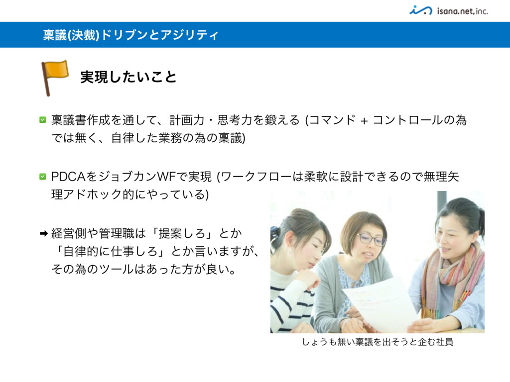 ࣮ݱ͍ͨ͜͠ͱ ٞॻ࡞Λ௨ͯ͠ɺܭըྗɾࢥߟྗΛ͑Δ ίϚϯυ ίϯτϩʔϧͷҝ Ͱແ͘ɺࣗͨ͠ۀͷҝͷٞ 1%$"ΛδϣϒΧϯ8'Ͱ࣮ݱ ϫʔΫϑϩʔॊೈʹઃܭͰ͖ΔͷͰແཧ ཧΞυϗοΫతʹ͍ͬͯΔ