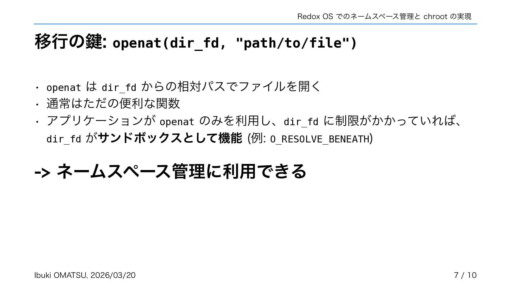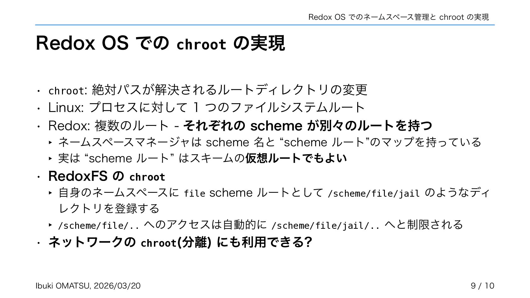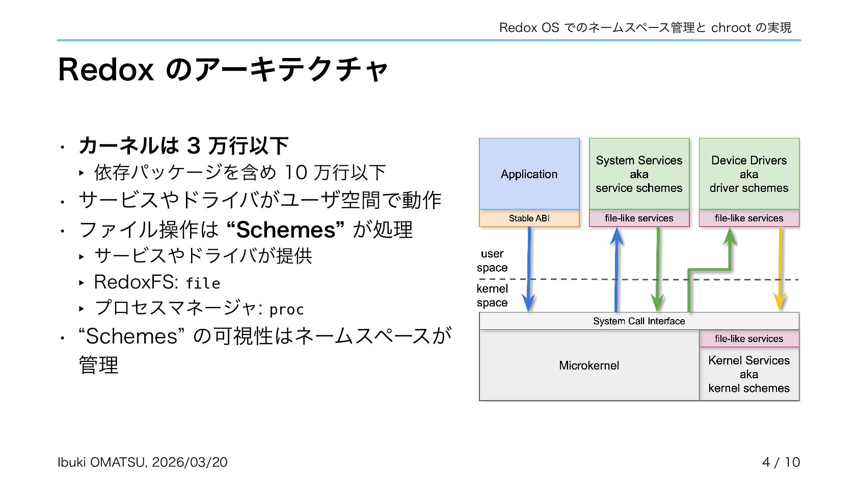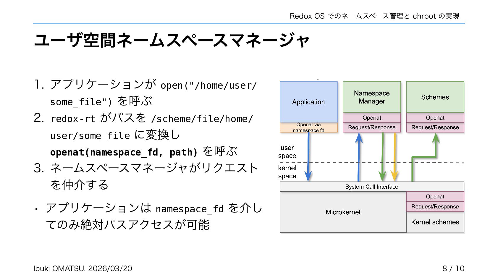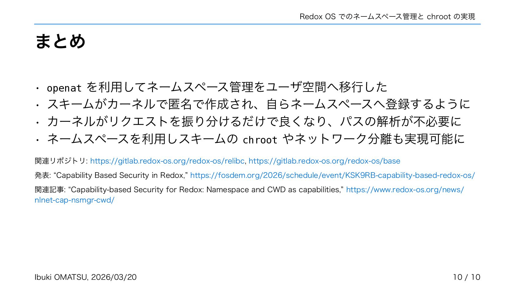 スキームがカーネルで匿名で作成され、自らネームスペースへ登録するように • カーネルがリクエストを振り分けるだけで良くなり、パスの解析が不必要に • ネームスペースを利用しスキームの chroot やネットワーク分離も実現可能に 関連リポジトリ: https://gitlab.redox-os.org/redox-os/relibc, https://gitlab.redox-os.org/redox-os/base 発表: “Capability Based Security in Redox,” https://fosdem.org/2026/schedule/event/KSK9RB-capability-based-redox-os/ 関連記事: “Capability-based Security for Redox: Namespace and CWD as capabilities,” https://www.redox-os.org/news/ nlnet-cap-nsmgr-cwd/ Ibuki OMATSU, 2026/03/20 10 / 10