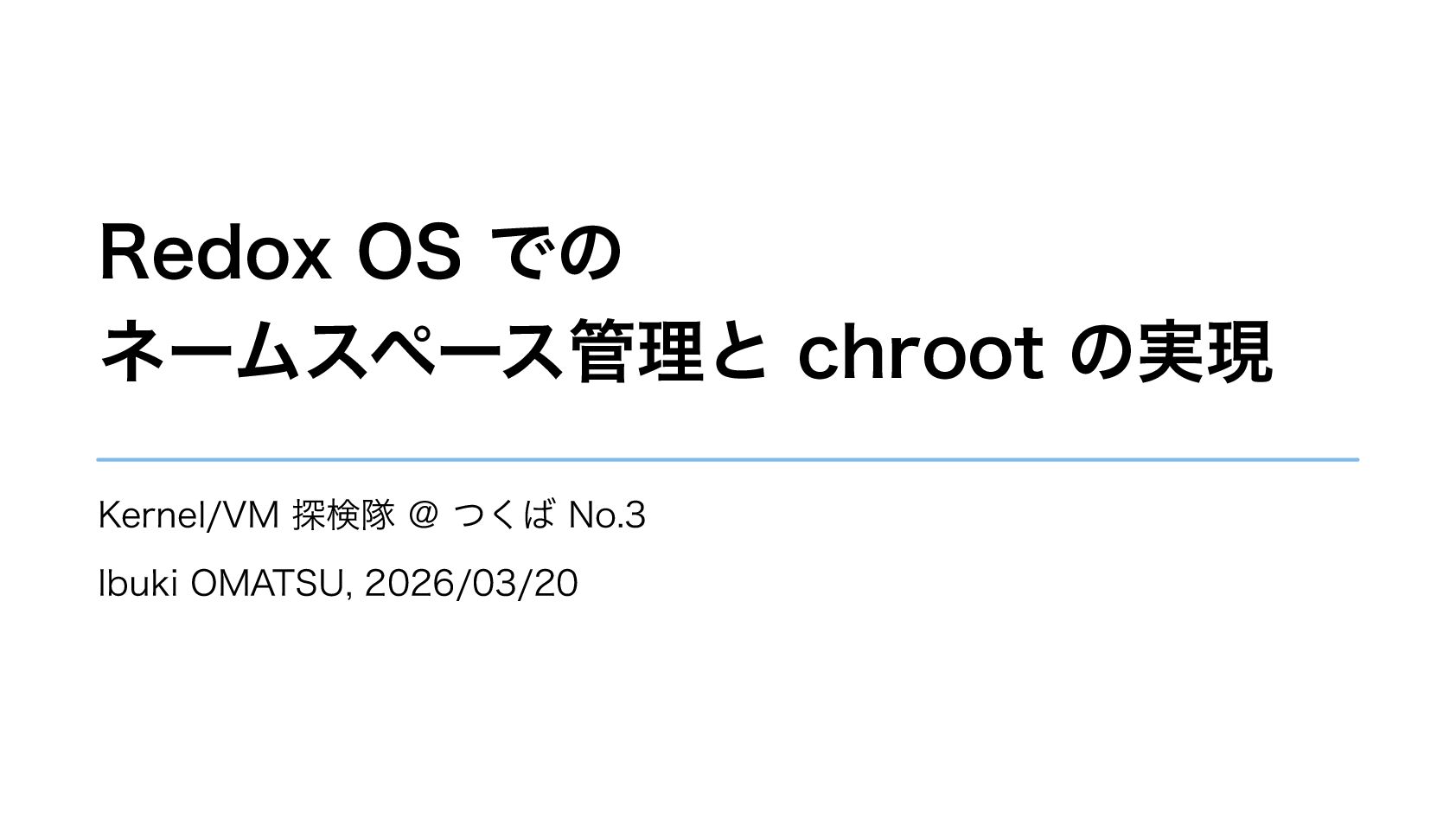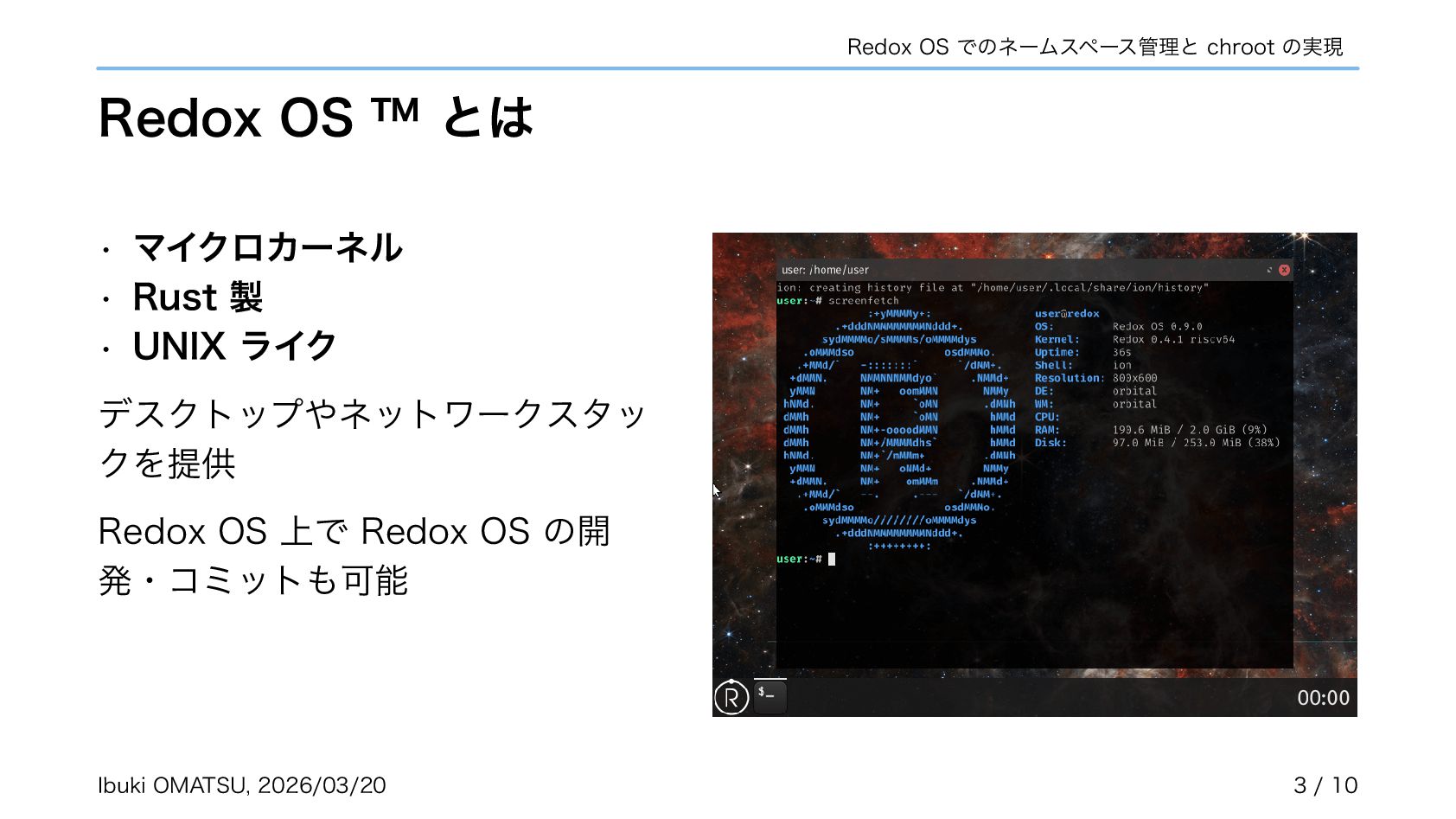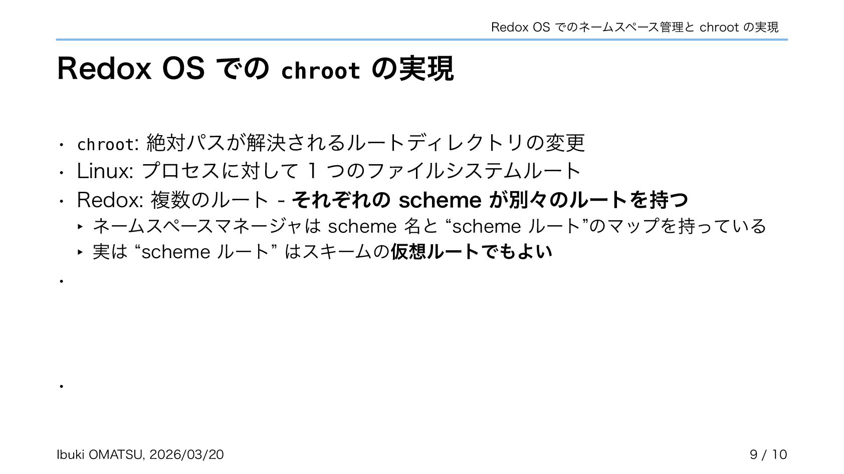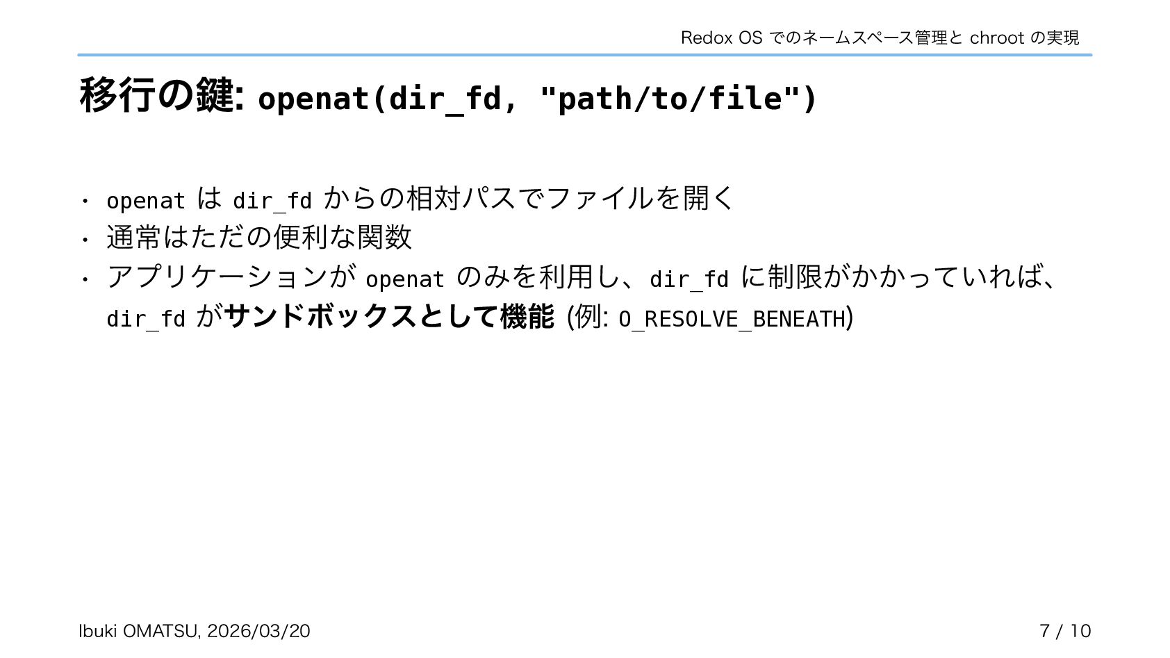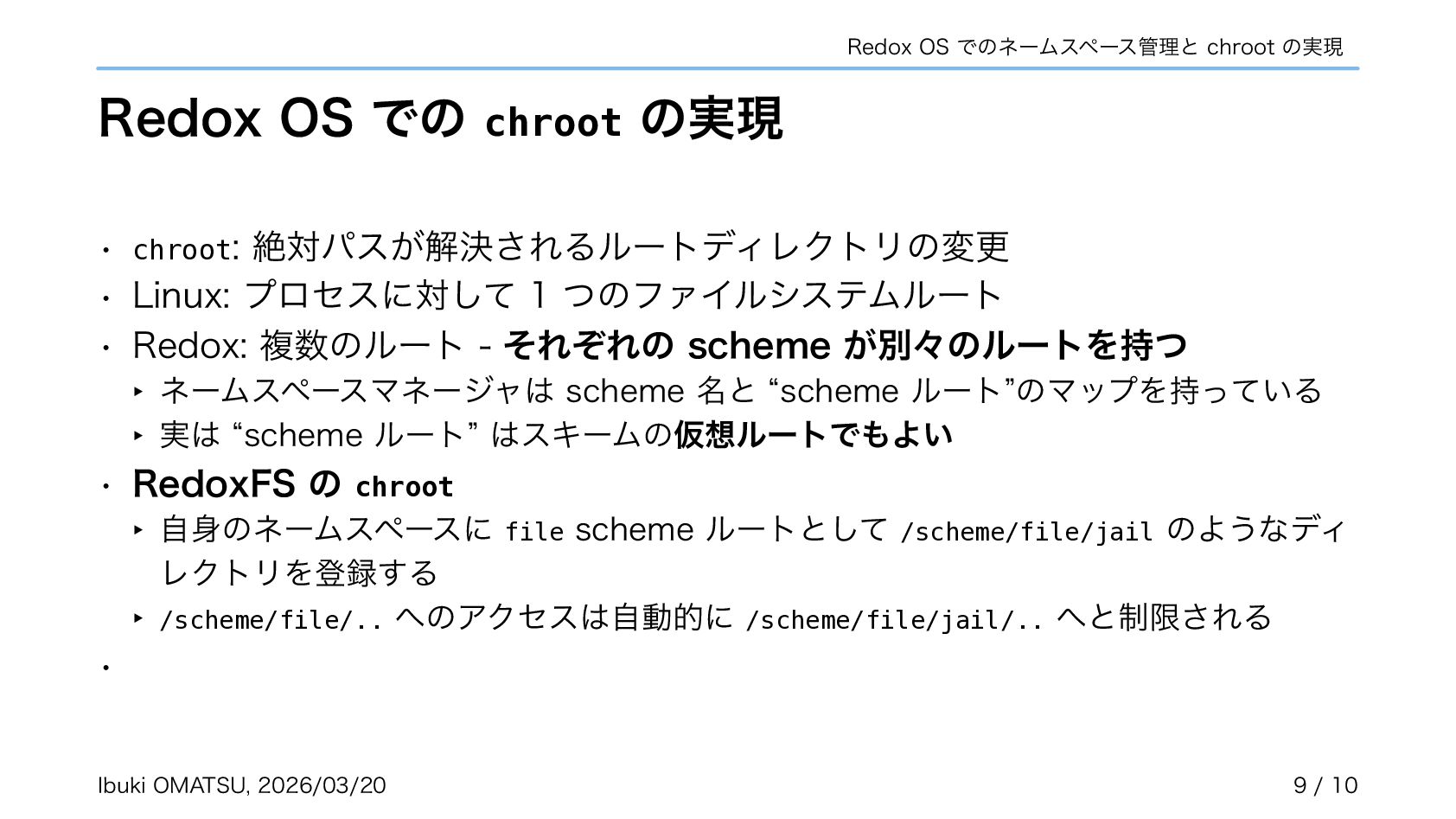スキームがカーネルで匿名で作成され、自らネームスペースへ登録するように • カーネルがリクエストを振り分けるだけで良くなり、パスの解析が不必要に • ネームスペースを利用しスキームの chroot やネットワーク分離も実現可能に 関連リポジトリ: https://gitlab.redox-os.org/redox-os/relibc, https://gitlab.redox-os.org/redox-os/base 発表: “Capability Based Security in Redox,” https://fosdem.org/2026/schedule/event/KSK9RB-capability-based-redox-os/ 関連記事: “Capability-based Security for Redox: Namespace and CWD as capabilities,” https://www.redox-os.org/news/ nlnet-cap-nsmgr-cwd/ Ibuki OMATSU, 2026/03/20 10 / 10