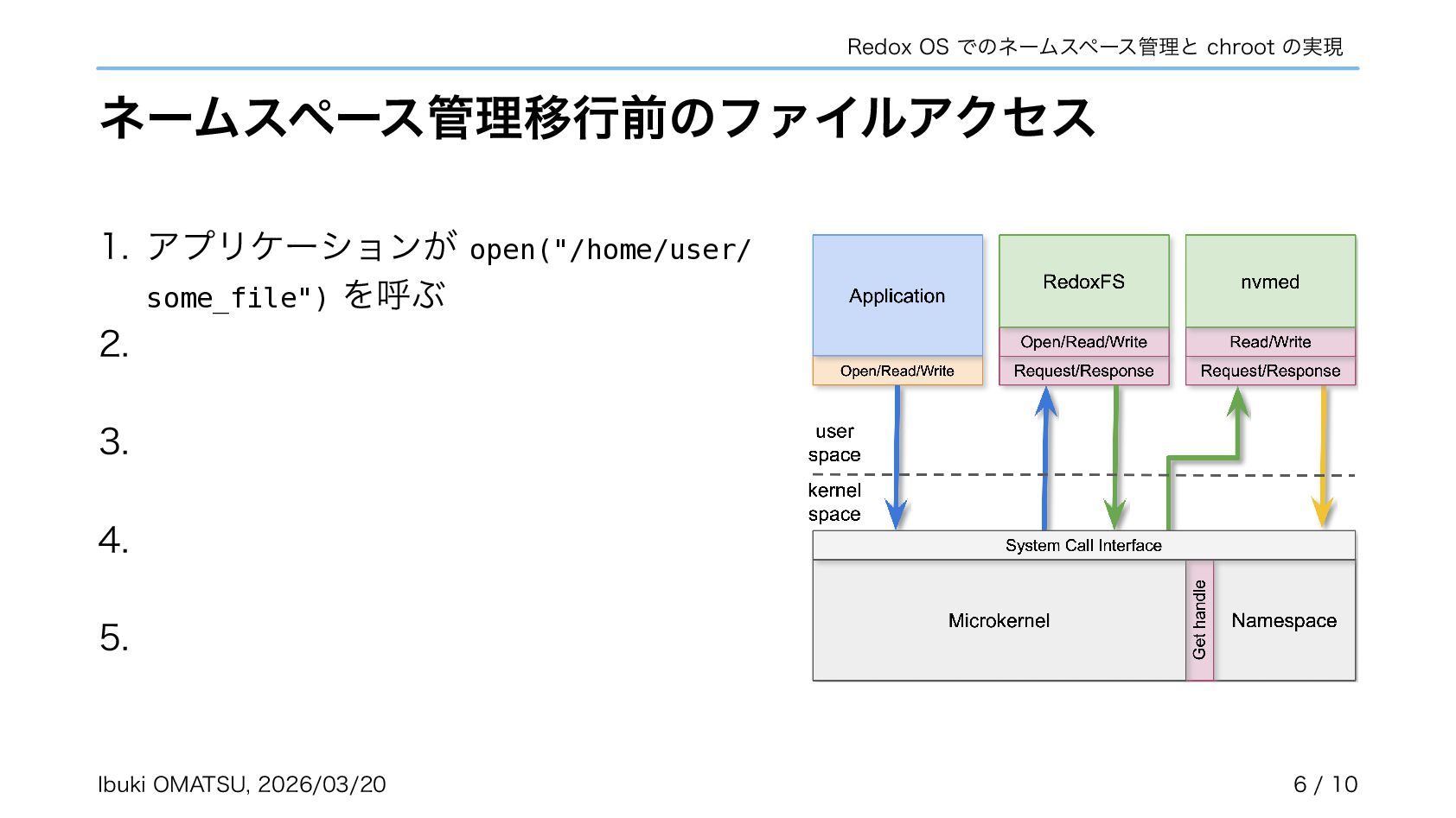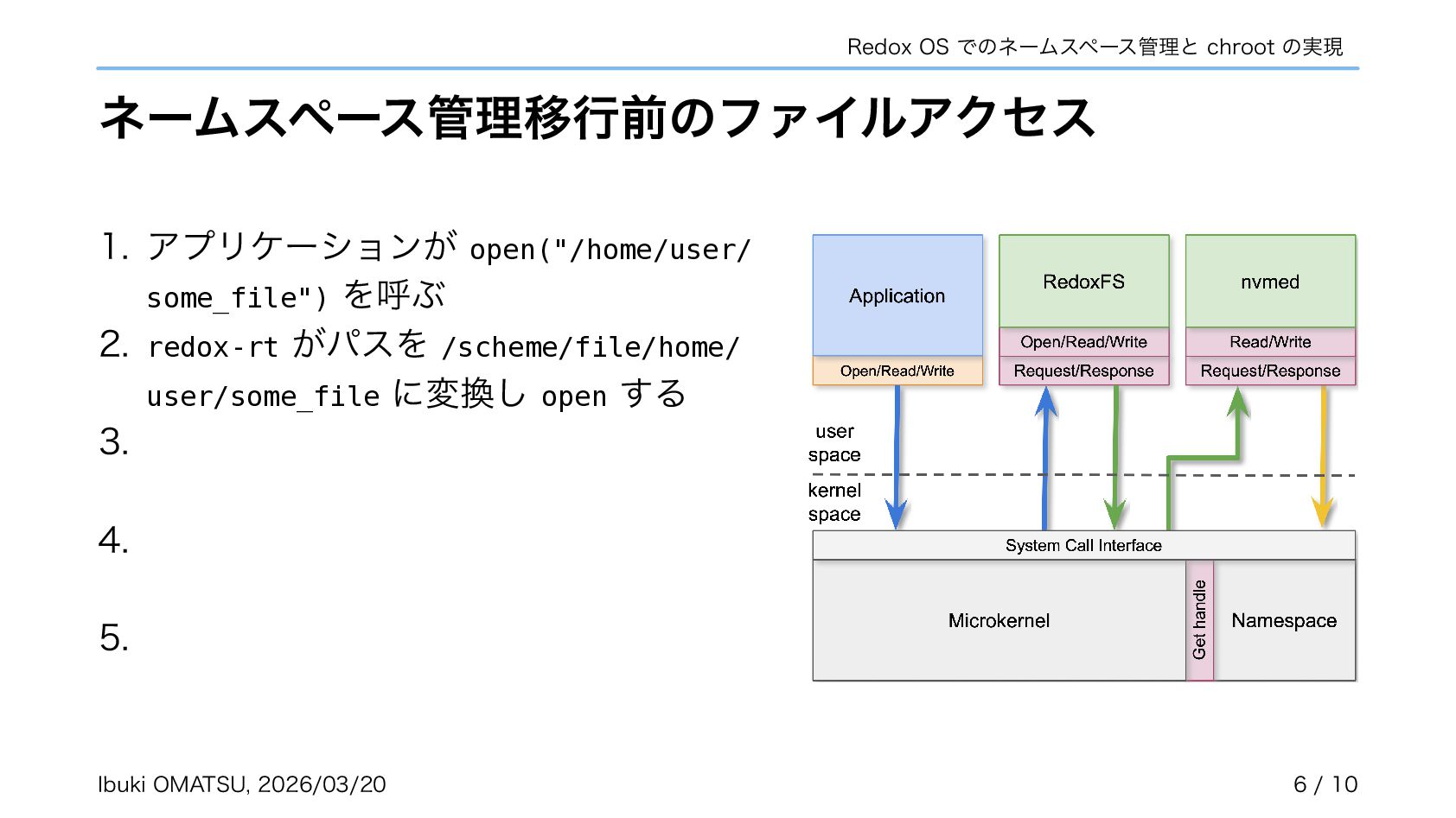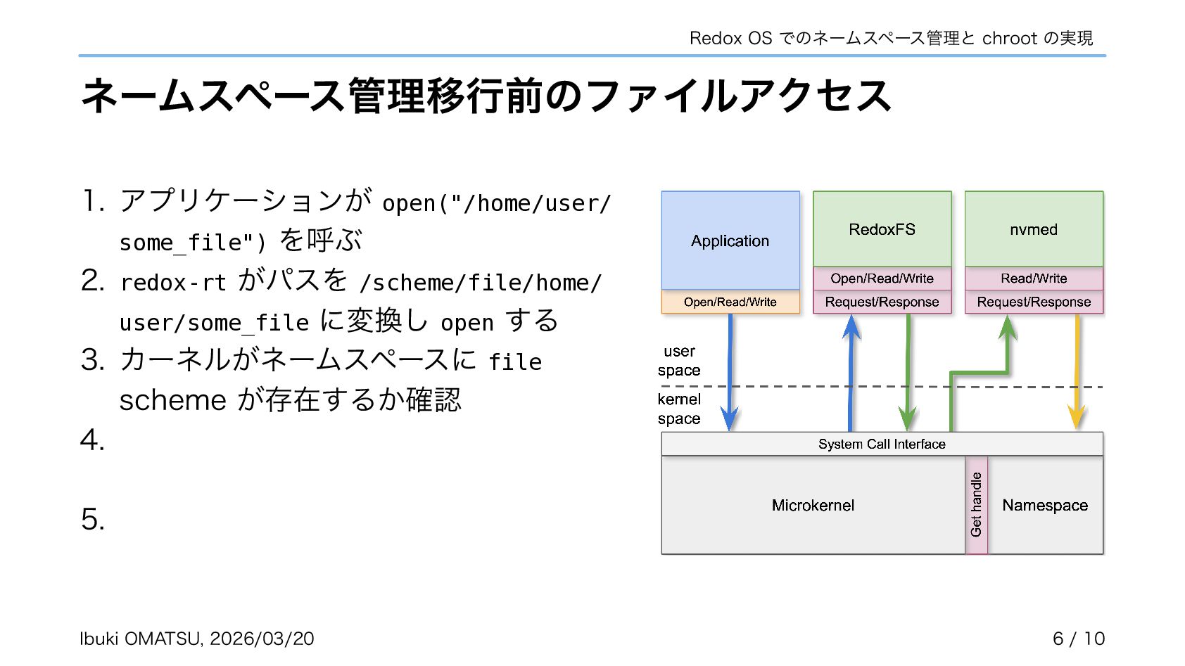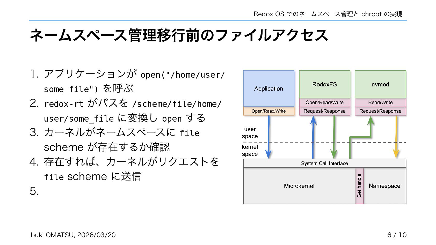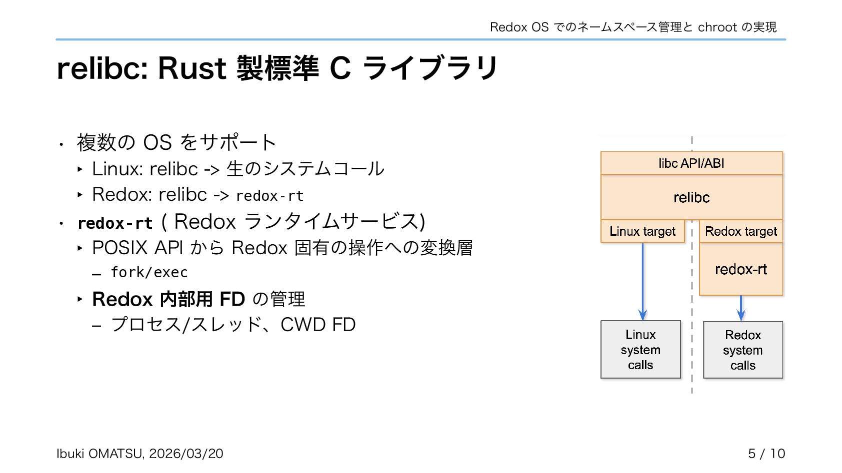 スキームがカーネルで匿名で作成され、自らネームスペースへ登録するように • カーネルがリクエストを振り分けるだけで良くなり、パスの解析が不必要に • ネームスペースを利用しスキームの chroot やネットワーク分離も実現可能に 関連リポジトリ: https://gitlab.redox-os.org/redox-os/relibc, https://gitlab.redox-os.org/redox-os/base 発表: “Capability Based Security in Redox,” https://fosdem.org/2026/schedule/event/KSK9RB-capability-based-redox-os/ 関連記事: “Capability-based Security for Redox: Namespace and CWD as capabilities,” https://www.redox-os.org/news/ nlnet-cap-nsmgr-cwd/ Ibuki OMATSU, 2026/03/20 10 / 10