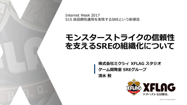 モンスターストライクの信頼性 を⽀えるSREの組織化について 株式会社ミクシィ XFLAG スタジオ ゲーム開発室 SREグループ 清⽔ 勲 Internet