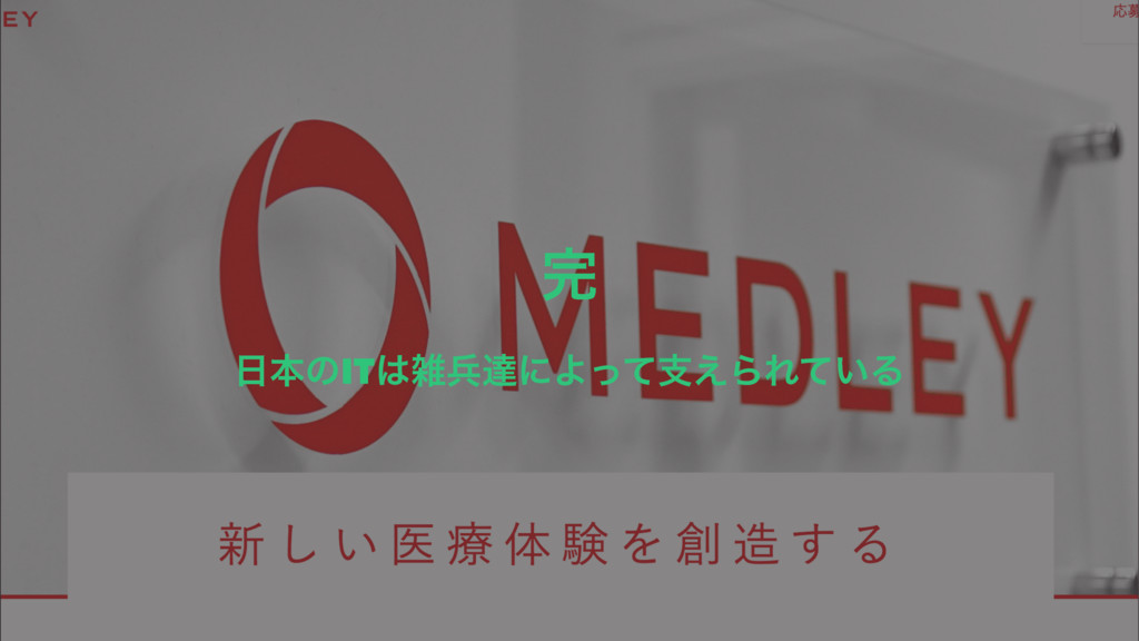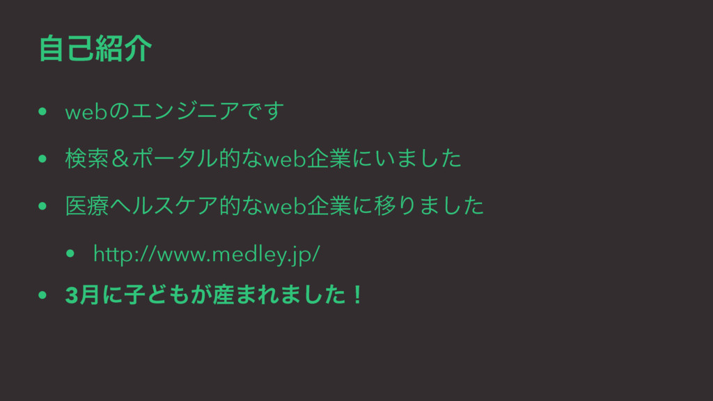ࣗݾհ • webͷΤϯδχΞͰ͢ • ݕࡧˍϙʔλϧతͳwebاۀʹ͍·ͨ͠ • ҩྍϔϧεέΞతͳwebاۀʹҠΓ·ͨ͠ • http://www.medley.jp/ •