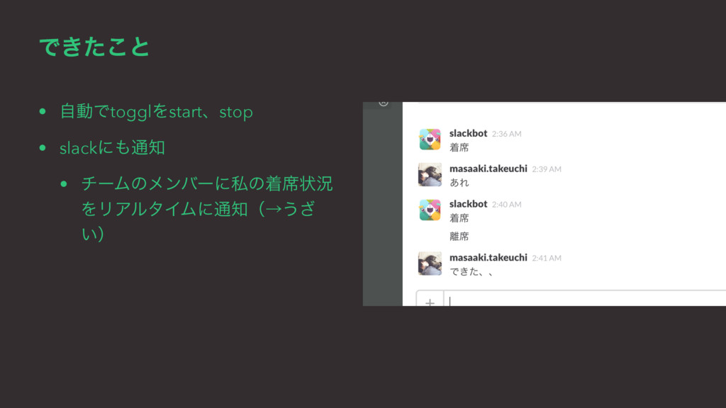 Ͱ͖ͨ͜ͱ • ࣗಈͰtogglΛstartɺstop • slackʹ௨ • νʔϜͷϝϯόʔʹࢲͷண੮ঢ়گ ΛϦΞϧλΠϜʹ௨ʢˠ͏͟ ͍ʣ