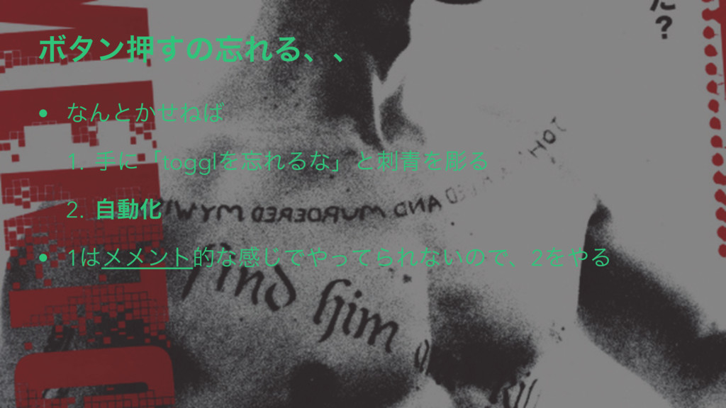 Ϙλϯԡ͢ͷΕΔɺɺ • ͳΜͱ͔ͤͶ 1. खʹʮtogglΛΕΔͳʯͱ੨ΛூΔ 2. ࣗಈԽ • 1ϝϝϯτతͳײ͡ͰͬͯΒΕͳ͍ͷͰɺ2ΛΔ