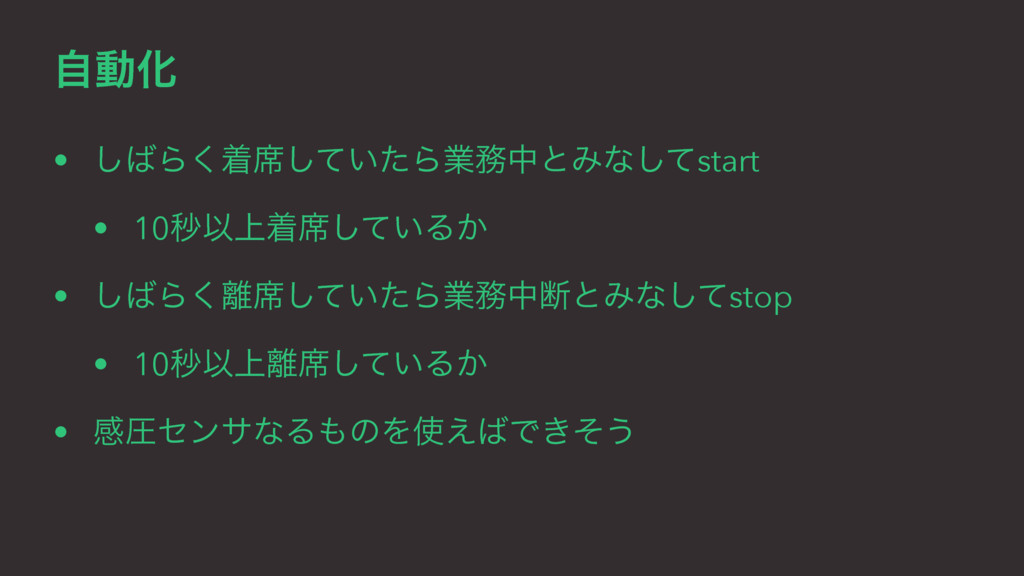 ࣗಈԽ • ͠Β͘ண੮͍ͯͨ͠ΒۀதͱΈͳͯ͠start • 10ඵҎ্ண੮͍ͯ͠Δ͔ • ͠Β͘੮͍ͯͨ͠ΒۀதஅͱΈͳͯ͠stop • 10ඵҎ্੮͍ͯ͠Δ͔ •