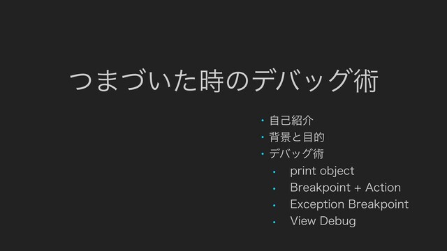 Action w ॲཧΛ௨ΔͨͼʹΛ֬ೝ͍ͨ͠ • Exception Breakpoint w ΞϓϦΫϥογϡͷݪҼ͕Γ͍ͨ • View Debug w UI্ͷΛΓ͍ͨ