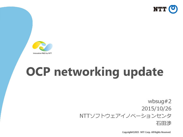• OCP networking update, NTT 石田 • SDN and Open Movement on White box Rob Sherwood, CTO Big switch networks • The Open Ethernet White Box Amir Sheffer, Senior Product Manager Mellanox Technologies • 2 Years of White Box Networking in Production Jonathan LaCour VP Cloud Dreamhost, Nolan Leake Co-Founder and CTO, Cumulus Networks • 今回はホワイトボックススイッチ・Open Networkingの立役 者である3社による ホワイトボックススイッチの最前線につ いて発表いただきます • また既に2年間ホワイトボックススイッチ・Cumulus Linuxを 利用している実ユーザにもお越しいただき、その体験談をお 話いただきます