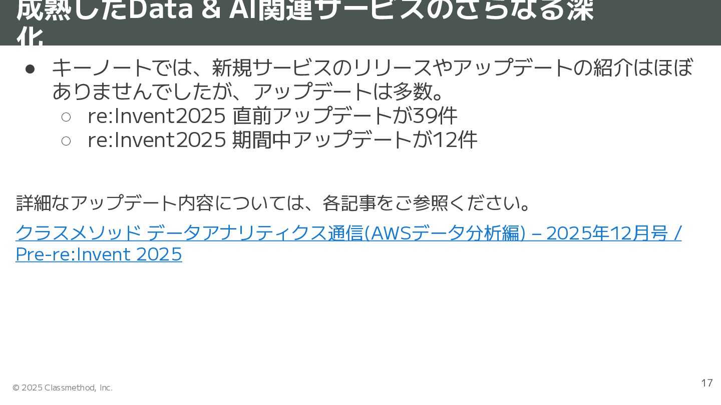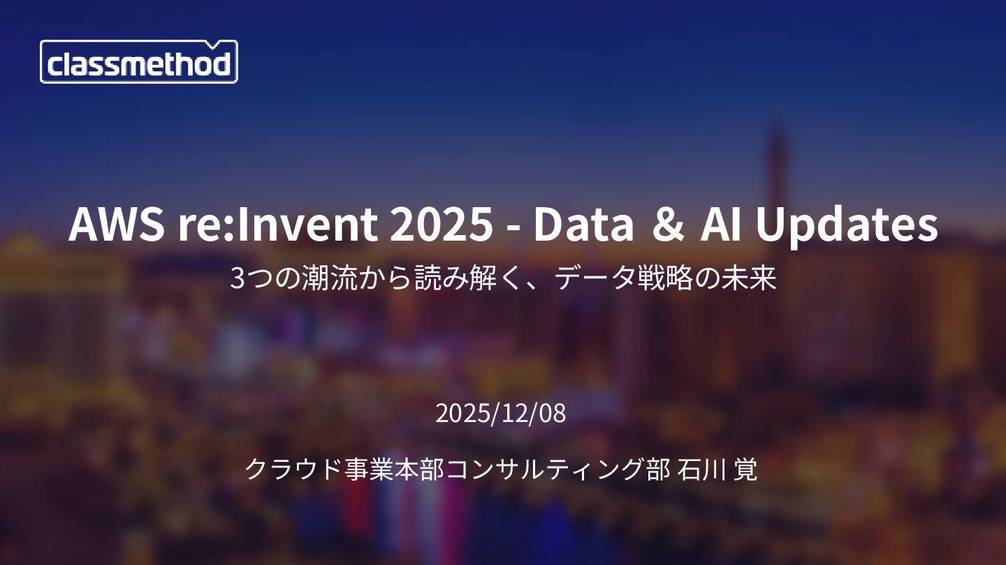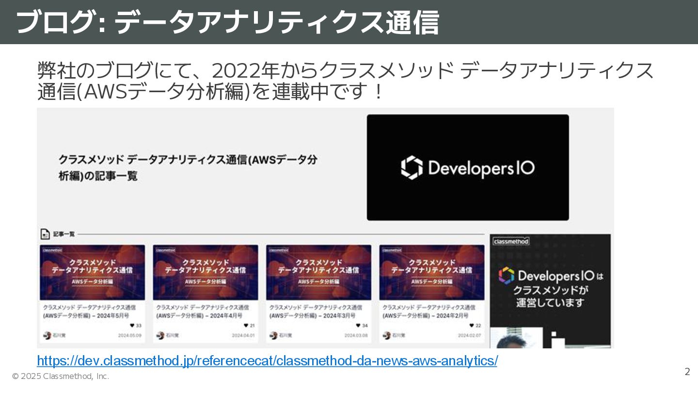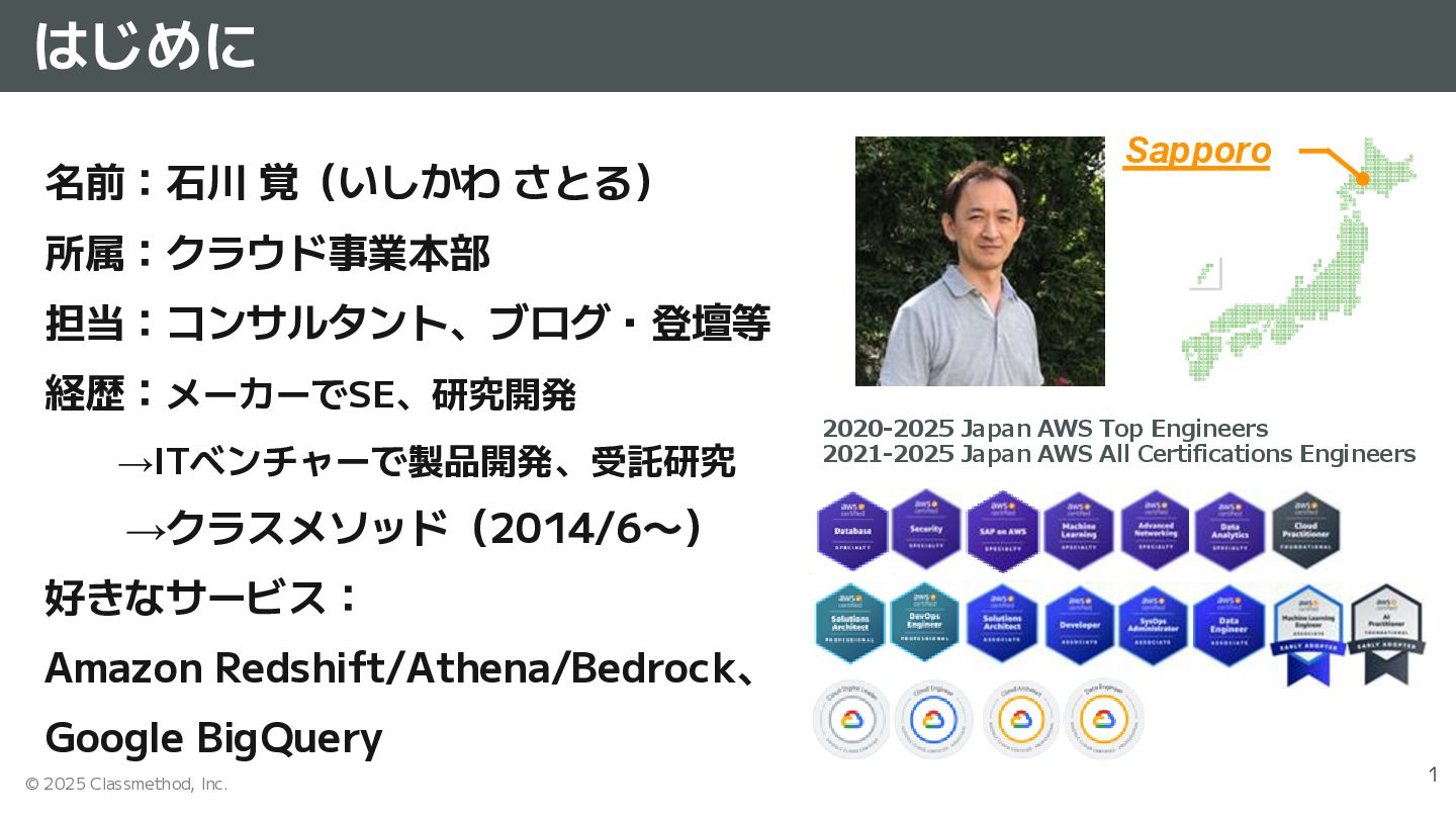 担当:コンサルタント、ブログ・登壇等 経歴:メーカーでSE、研究開発 →ITベンチャーで製品開発、受託研究 →クラスメソッド(2014/6〜) 好きなサービス: Amazon Redshift/Athena/Bedrock、 Google BigQuery Sapporo 2020-2025 Japan AWS Top Engineers 2021-2025 Japan AWS All Certifications Engineers