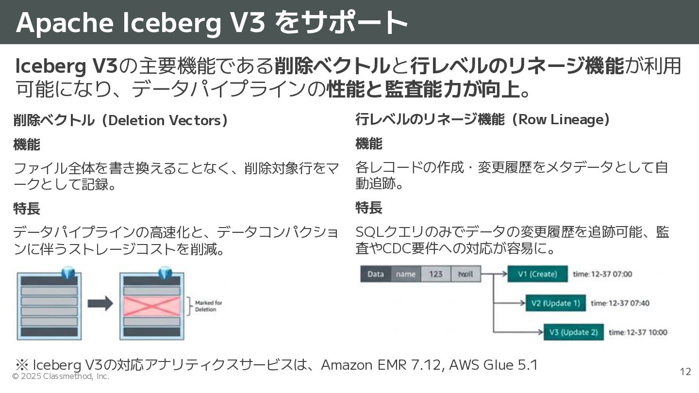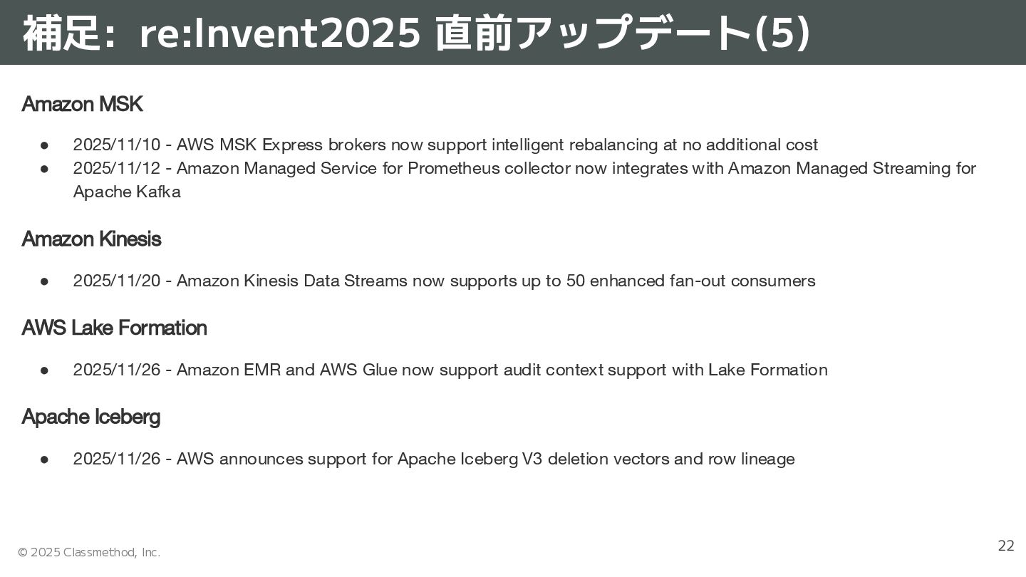 • 2025/11/10 - AWS MSK Express brokers now support intelligent rebalancing at no additional cost • 2025/11/12 - Amazon Managed Service for Prometheus collector now integrates with Amazon Managed Streaming for Apache Kafka Amazon Kinesis • 2025/11/20 - Amazon Kinesis Data Streams now supports up to 50 enhanced fan-out consumers AWS Lake Formation • 2025/11/26 - Amazon EMR and AWS Glue now support audit context support with Lake Formation Apache Iceberg • 2025/11/26 - AWS announces support for Apache Iceberg V3 deletion vectors and row lineage