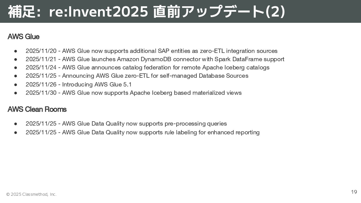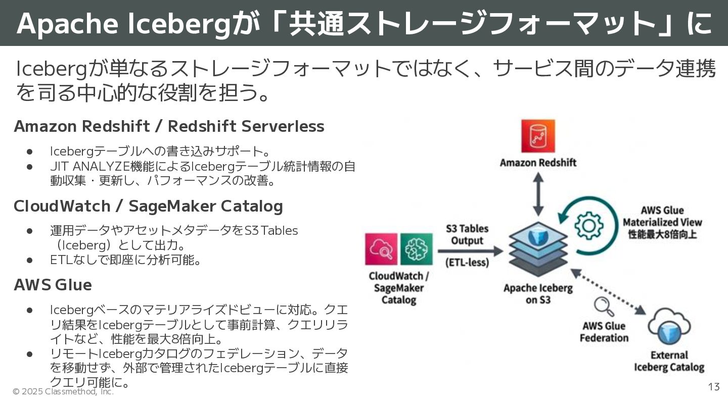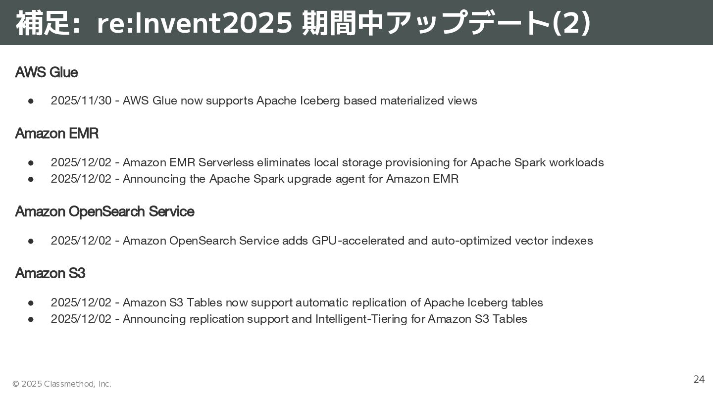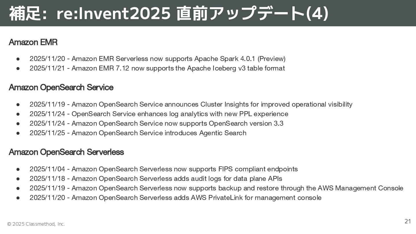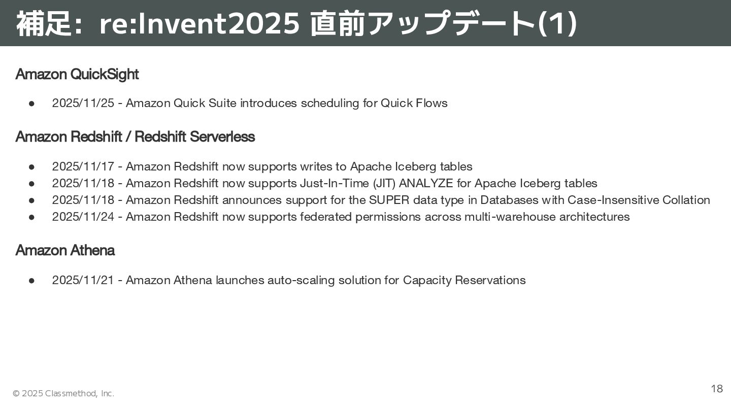 • 2025/11/25 - Amazon Quick Suite introduces scheduling for Quick Flows Amazon Redshift / Redshift Serverless • 2025/11/17 - Amazon Redshift now supports writes to Apache Iceberg tables • 2025/11/18 - Amazon Redshift now supports Just-In-Time (JIT) ANALYZE for Apache Iceberg tables • 2025/11/18 - Amazon Redshift announces support for the SUPER data type in Databases with Case-Insensitive Collation • 2025/11/24 - Amazon Redshift now supports federated permissions across multi-warehouse architectures Amazon Athena • 2025/11/21 - Amazon Athena launches auto-scaling solution for Capacity Reservations