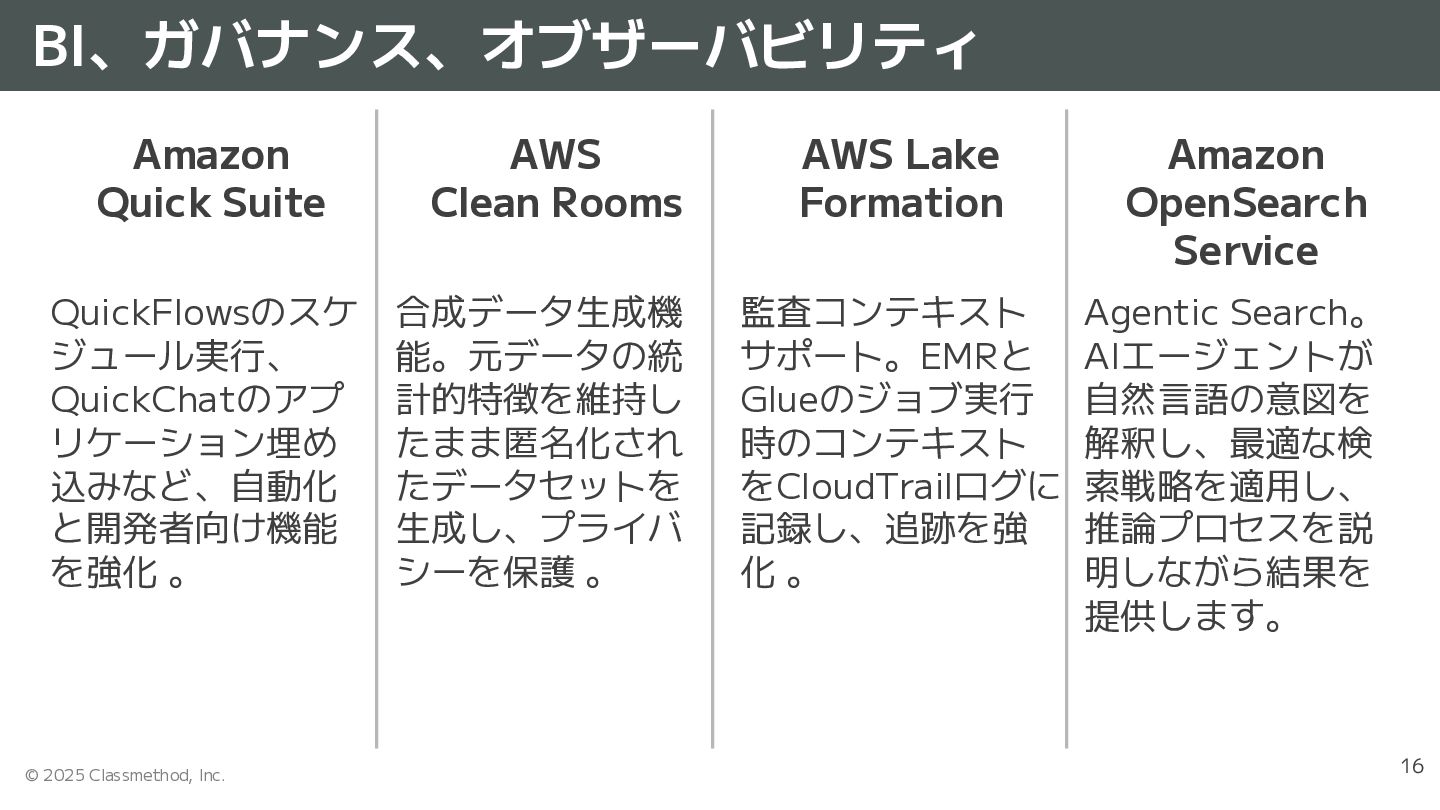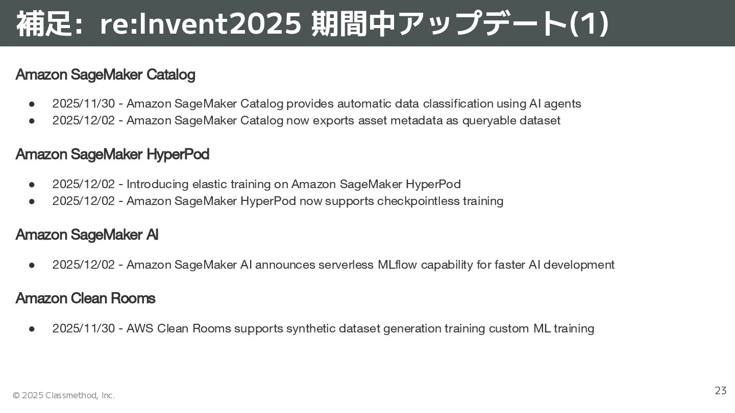 Catalog • 2025/11/30 - Amazon SageMaker Catalog provides automatic data classification using AI agents • 2025/12/02 - Amazon SageMaker Catalog now exports asset metadata as queryable dataset Amazon SageMaker HyperPod • 2025/12/02 - Introducing elastic training on Amazon SageMaker HyperPod • 2025/12/02 - Amazon SageMaker HyperPod now supports checkpointless training Amazon SageMaker AI • 2025/12/02 - Amazon SageMaker AI announces serverless MLflow capability for faster AI development Amazon Clean Rooms • 2025/11/30 - AWS Clean Rooms supports synthetic dataset generation training custom ML training
