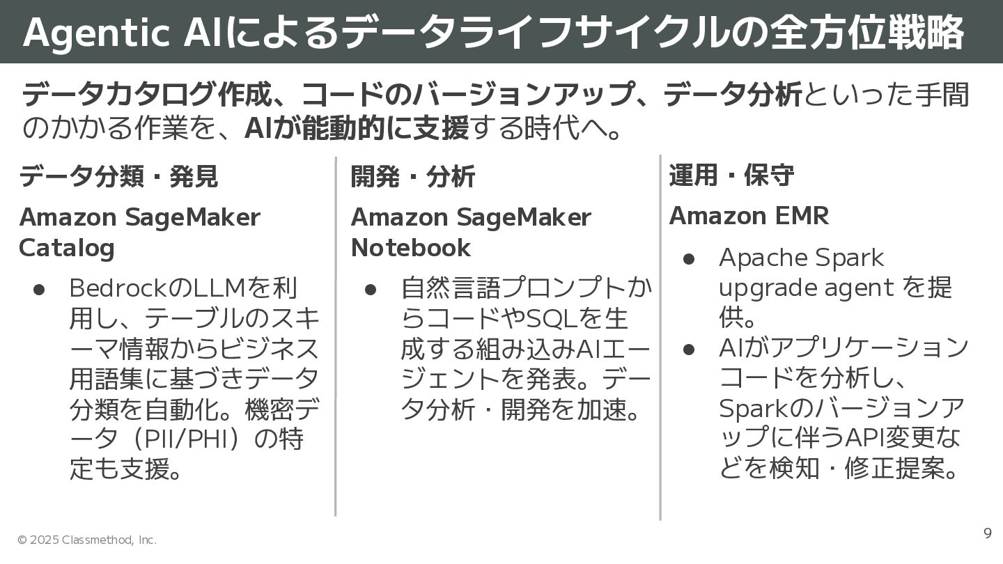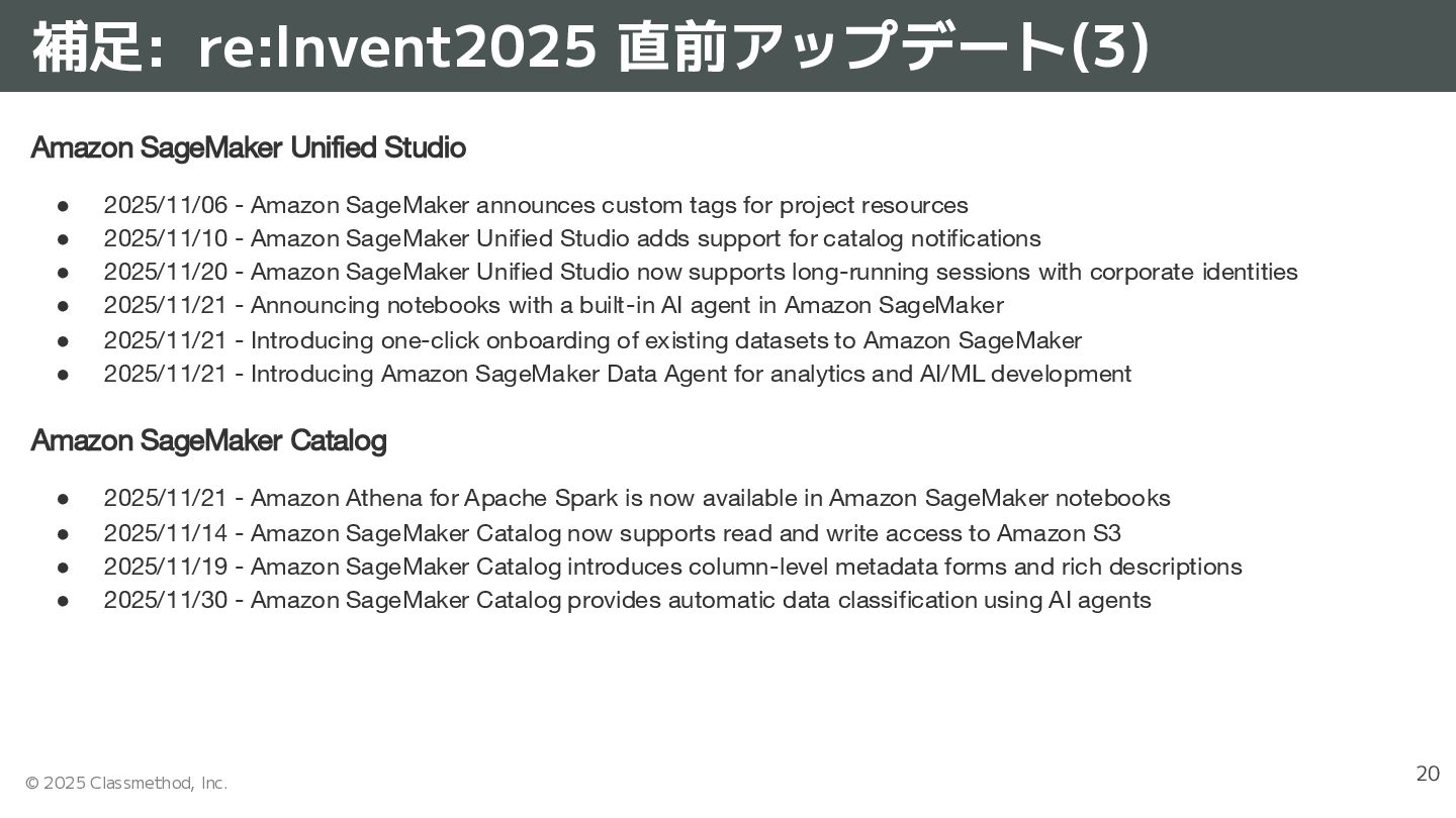Unified Studio • 2025/11/06 - Amazon SageMaker announces custom tags for project resources • 2025/11/10 - Amazon SageMaker Unified Studio adds support for catalog notifications • 2025/11/20 - Amazon SageMaker Unified Studio now supports long-running sessions with corporate identities • 2025/11/21 - Announcing notebooks with a built-in AI agent in Amazon SageMaker • 2025/11/21 - Introducing one-click onboarding of existing datasets to Amazon SageMaker • 2025/11/21 - Introducing Amazon SageMaker Data Agent for analytics and AI/ML development Amazon SageMaker Catalog • 2025/11/21 - Amazon Athena for Apache Spark is now available in Amazon SageMaker notebooks • 2025/11/14 - Amazon SageMaker Catalog now supports read and write access to Amazon S3 • 2025/11/19 - Amazon SageMaker Catalog introduces column-level metadata forms and rich descriptions • 2025/11/30 - Amazon SageMaker Catalog provides automatic data classification using AI agents