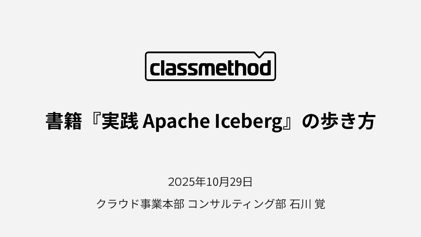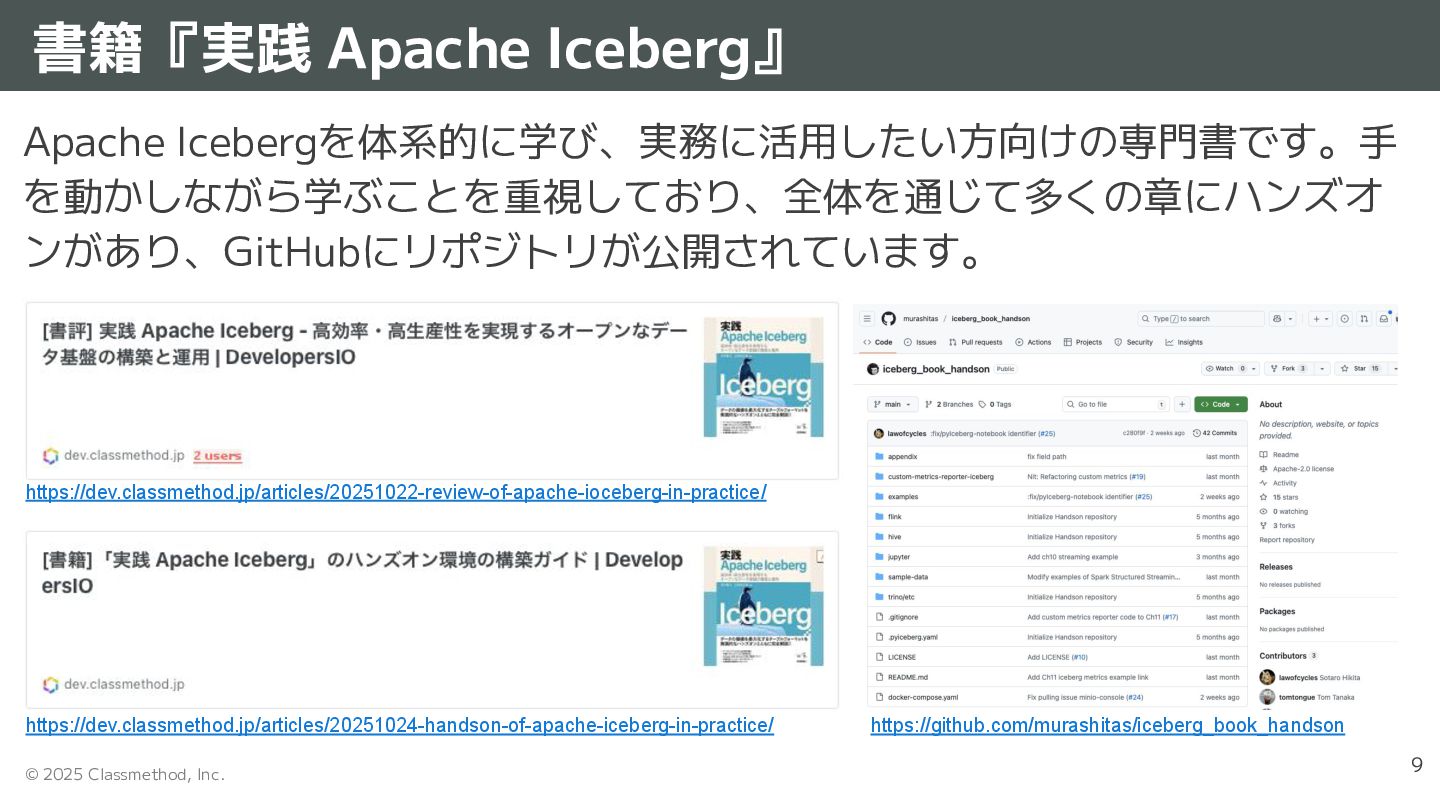 Apache Iceberg』 https://dev.classmethod.jp/articles/20251022-review-of-apache-ioceberg-in-practice/ https://dev.classmethod.jp/articles/20251024-handson-of-apache-iceberg-in-practice/ https://github.com/murashitas/iceberg_book_handson