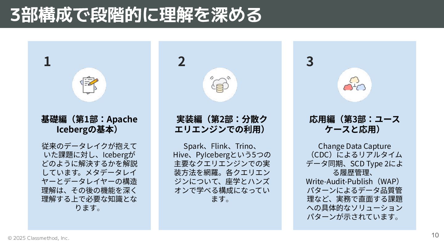 7. © 2025 Classmethod, Inc. 10 3部構成で段階的に理解を深める 基礎編(第1部:Apache Icebergの基本) 実装編(第2部:分散ク エリエンジンでの利⽤)