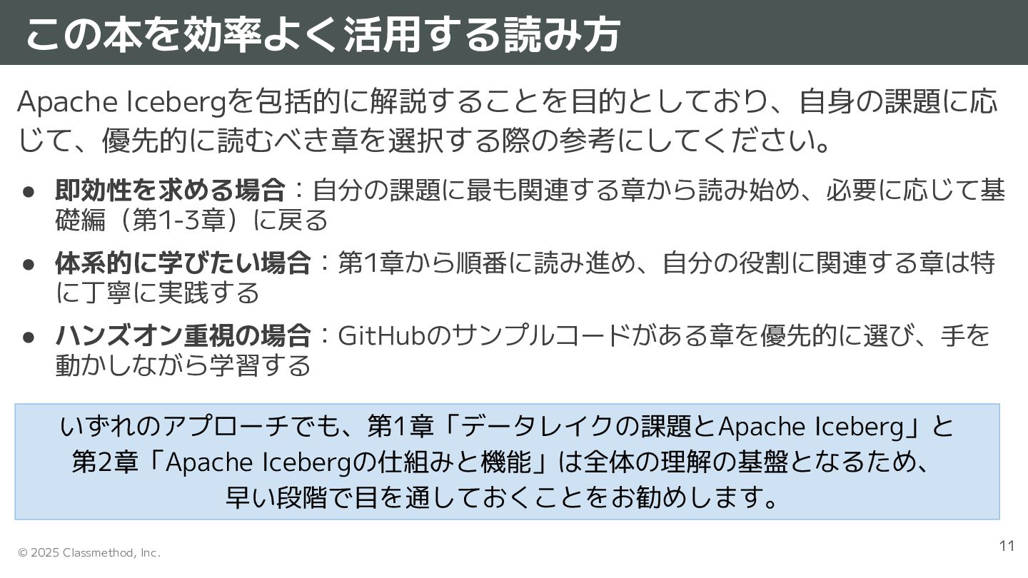 8. © 2025 Classmethod, Inc. 11 Apache Icebergを包括的に解説することを目的としており、自身の課題に応 じて、優先的に読むべき章を選択する際の参考にしてください。 • 即効性を求める場合:自分の課題に最も関連する章から読み始め、必要に応じて基