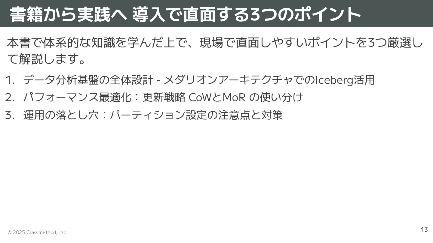 9. © 2025 Classmethod, Inc. 13 書籍から実践へ 導入で直面する3つのポイント 本書で体系的な知識を学んだ上で、現場で直面しやすいポイントを3つ厳選し て解説します。 1.
