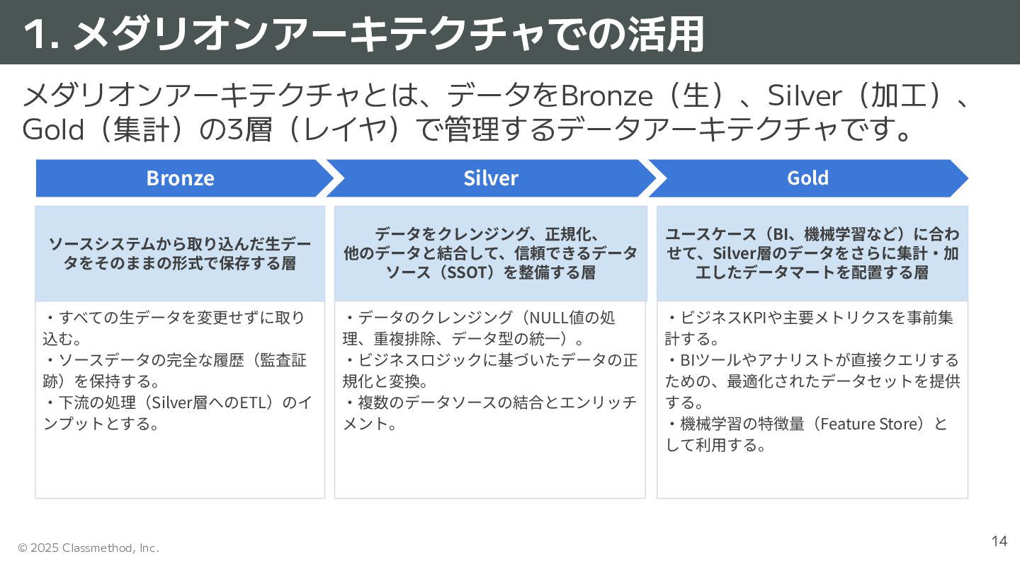 10. © 2025 Classmethod, Inc. 14 1. メダリオンアーキテクチャでの活用 Bronze Gold ‧すべての⽣データを変更せずに取り