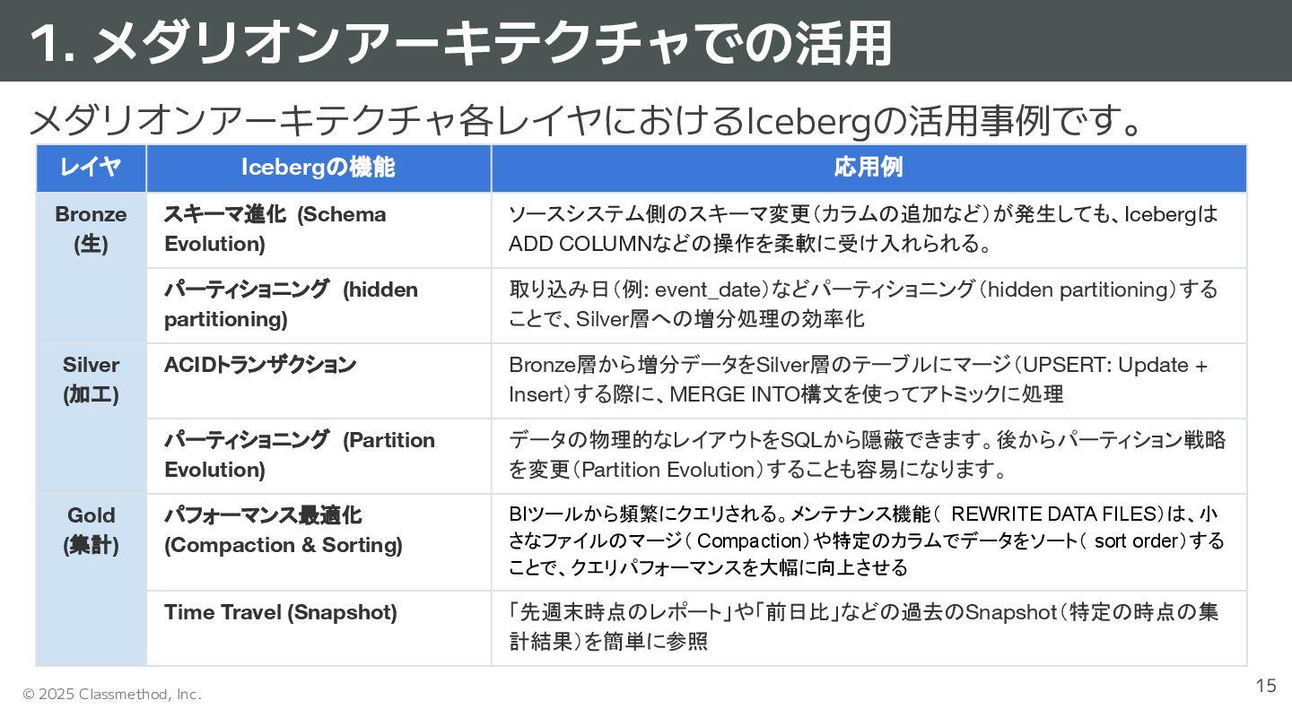 11. © 2025 Classmethod, Inc. 15 1. メダリオンアーキテクチャでの活用 レイヤ Icebergの機能 応用例