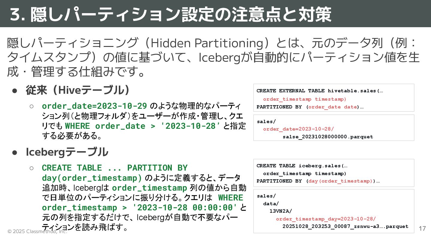 13. © 2025 Classmethod, Inc. 17 3. 隠しパーティション設定の注意点と対策 隠しパーティショニング(Hidden Partitioning)とは、元のデータ列(例: タイムスタンプ)の値に基づいて、Icebergが自動的にパーティション値を生