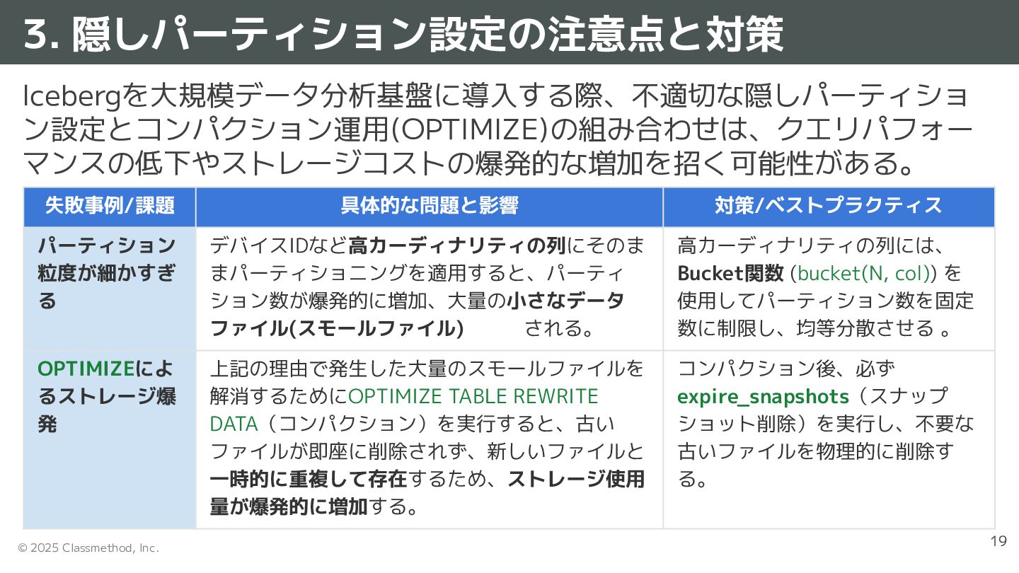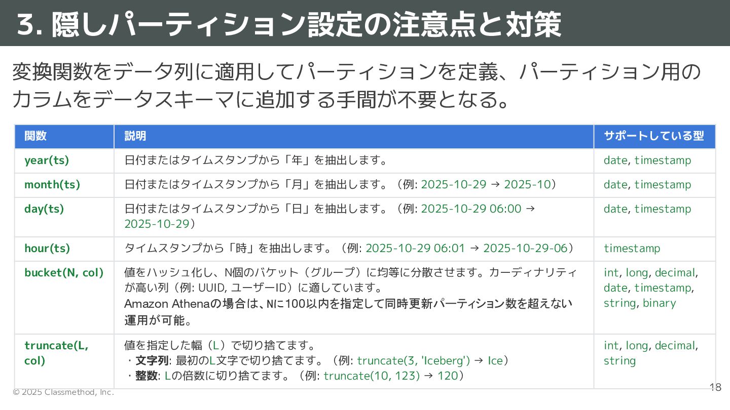 14. © 2025 Classmethod, Inc. 18 変換関数をデータ列に適用してパーティションを定義、パーティション用の カラムをデータスキーマに追加する手間が不要となる。 3. 隠しパーティション設定の注意点と対策 関数