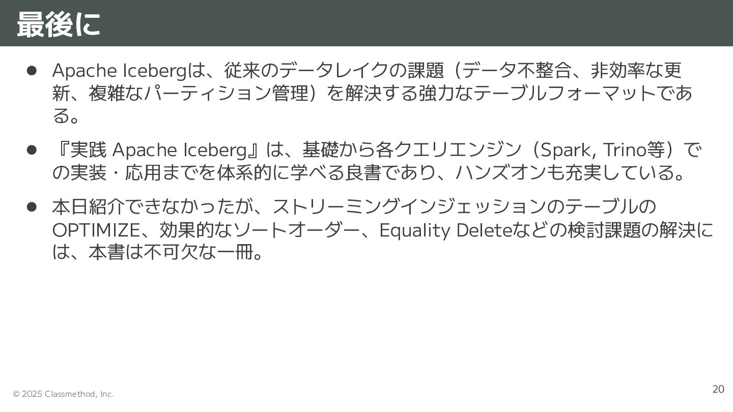 る。 • 『実践 Apache Iceberg』は、基礎から各クエリエンジン(Spark, Trino等)で の実装・応用までを体系的に学べる良書であり、ハンズオンも充実している。 • 本日紹介できなかったが、ストリーミングインジェッションのテーブルの OPTIMIZE、効果的なソートオーダー、Equality Deleteなどの検討課題の解決に は、本書は不可欠な一冊。