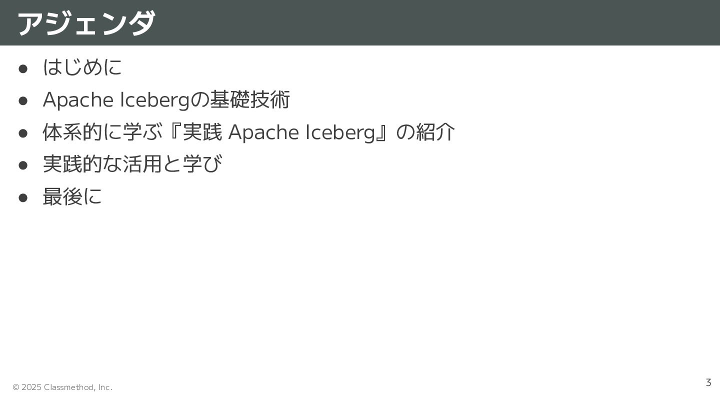 Icebergの基礎技術 • 体系的に学ぶ『実践 Apache Iceberg』の紹介 • 実践的な活用と学び • 最後に