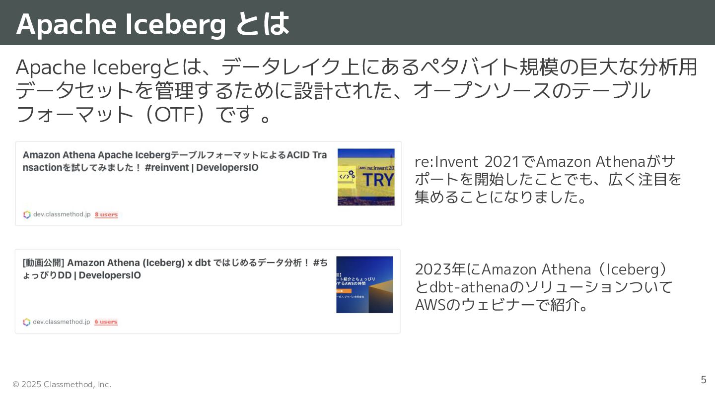 データセットを管理するために設計された、オープンソースのテーブル フォーマット(OTF)です 。 re:Invent 2021でAmazon Athenaがサ ポートを開始したことでも、広く注目を 集めることになりました。 2023年にAmazon Athena(Iceberg) とdbt-athenaのソリューションついて AWSのウェビナーで紹介。