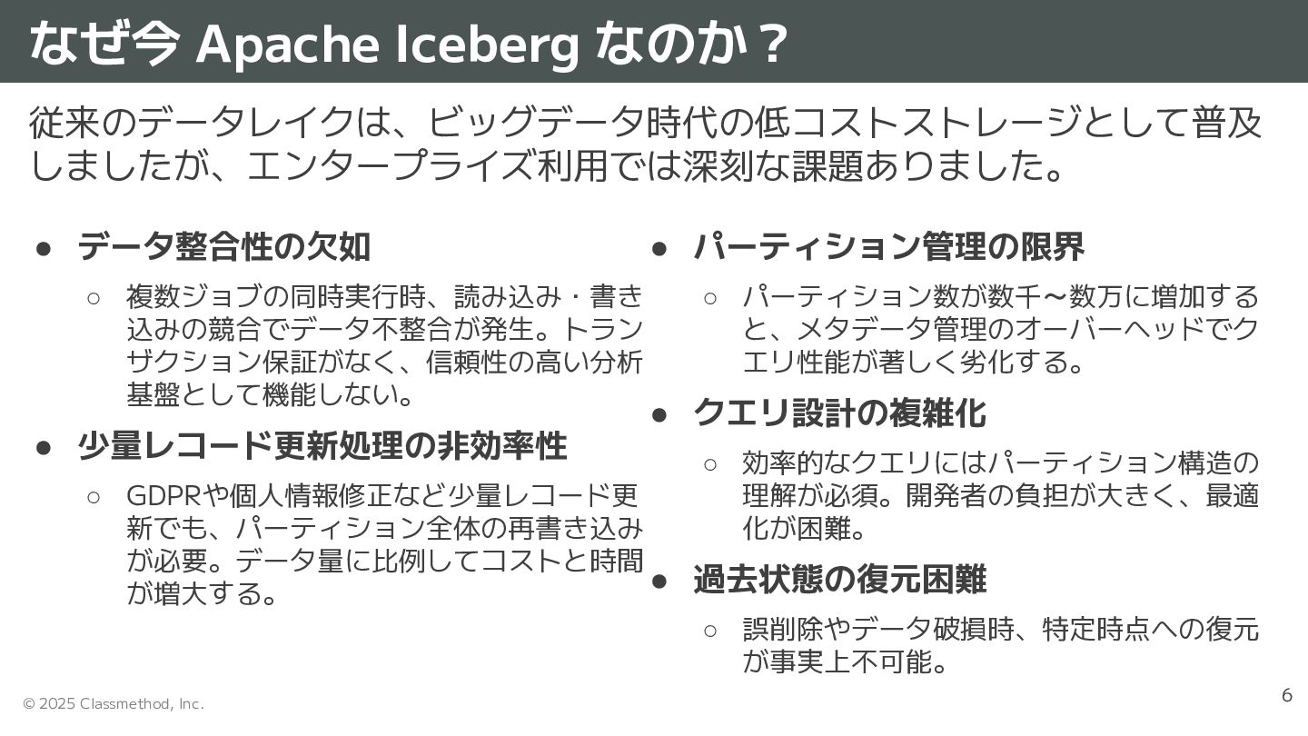 4. © 2025 Classmethod, Inc. 6 なぜ今 Apache Iceberg なのか? 従来のデータレイクは、ビッグデータ時代の低コストストレージとして普及