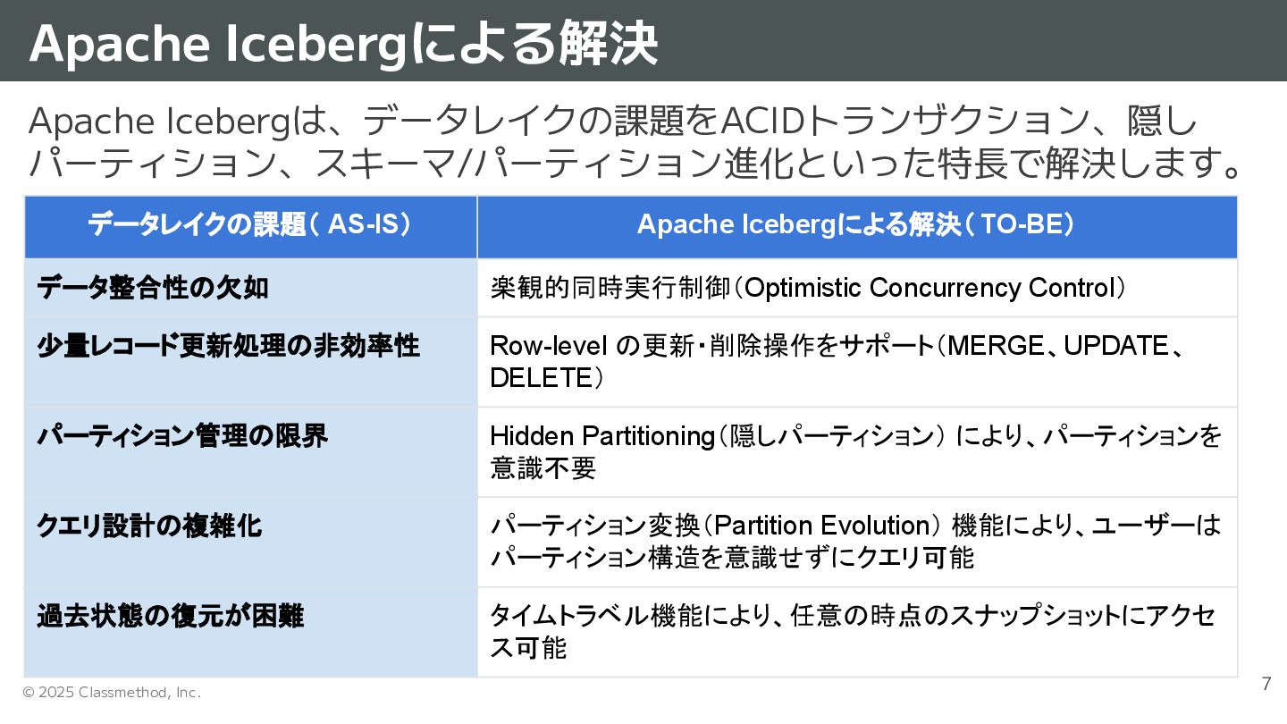 5. © 2025 Classmethod, Inc. 7 Apache Icebergによる解決 データレイクの課題( AS-IS) Apache
