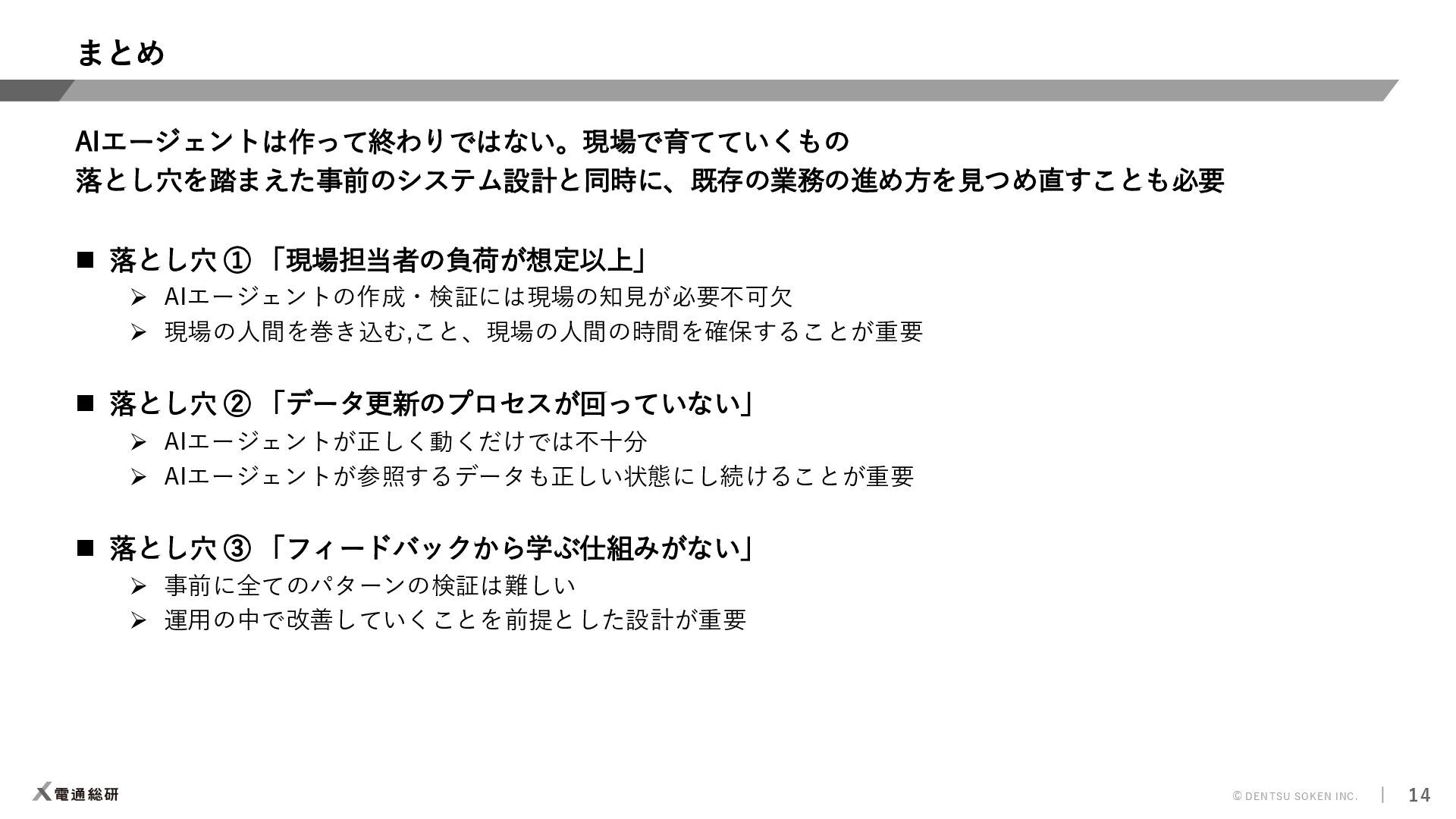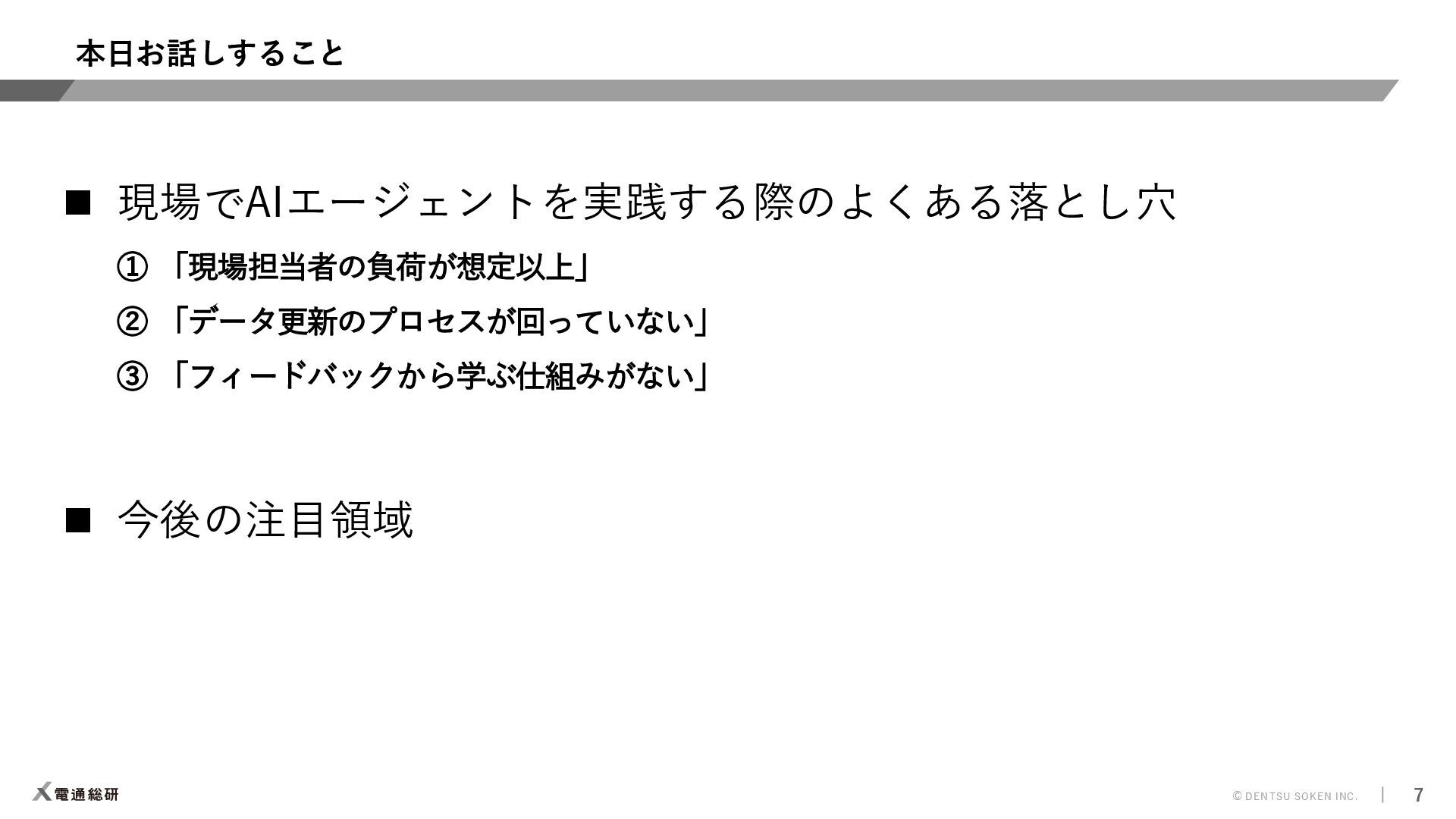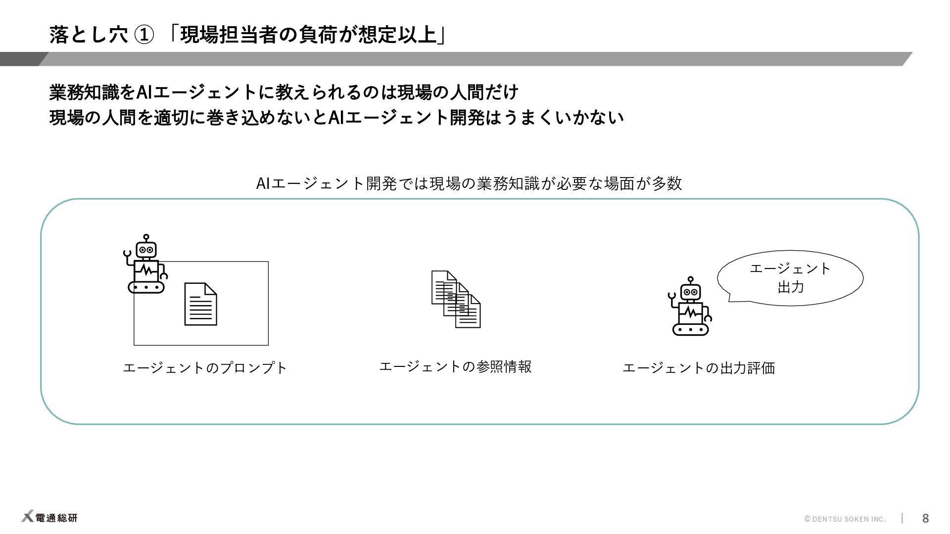AIエージェントを現場で実践する際の落とし穴について紹介します。