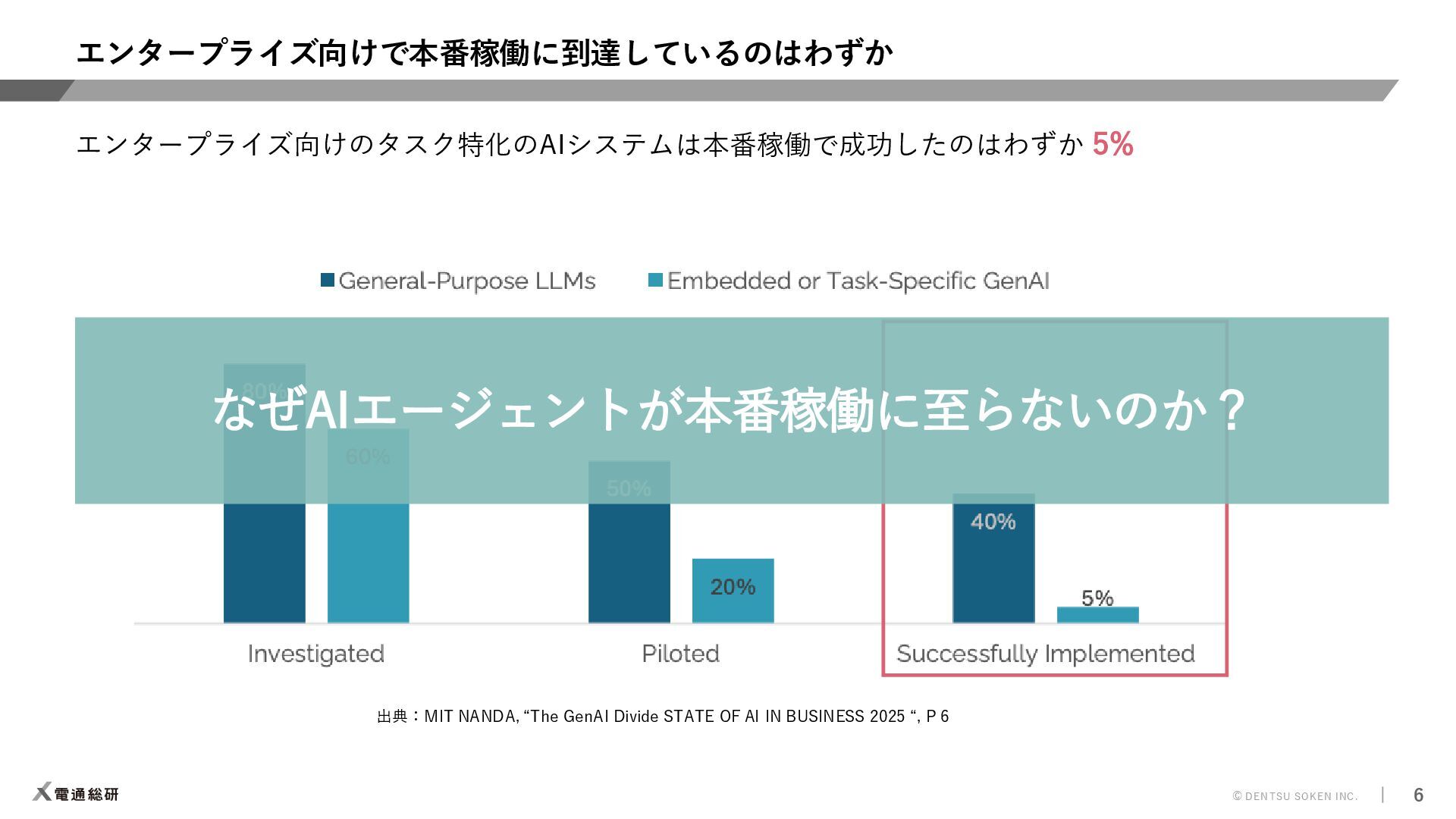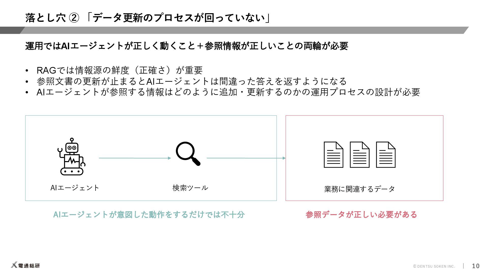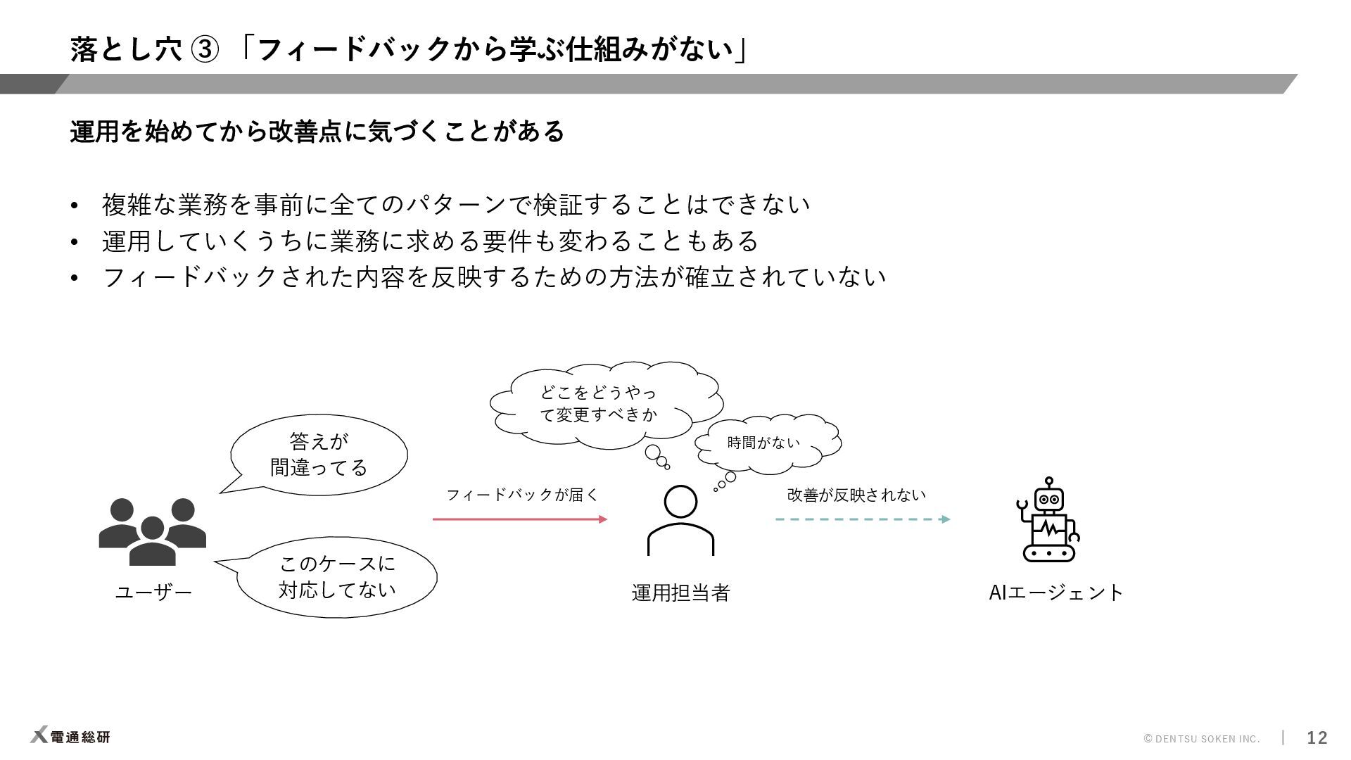 AIエージェントを現場で実践する際の落とし穴について紹介します。