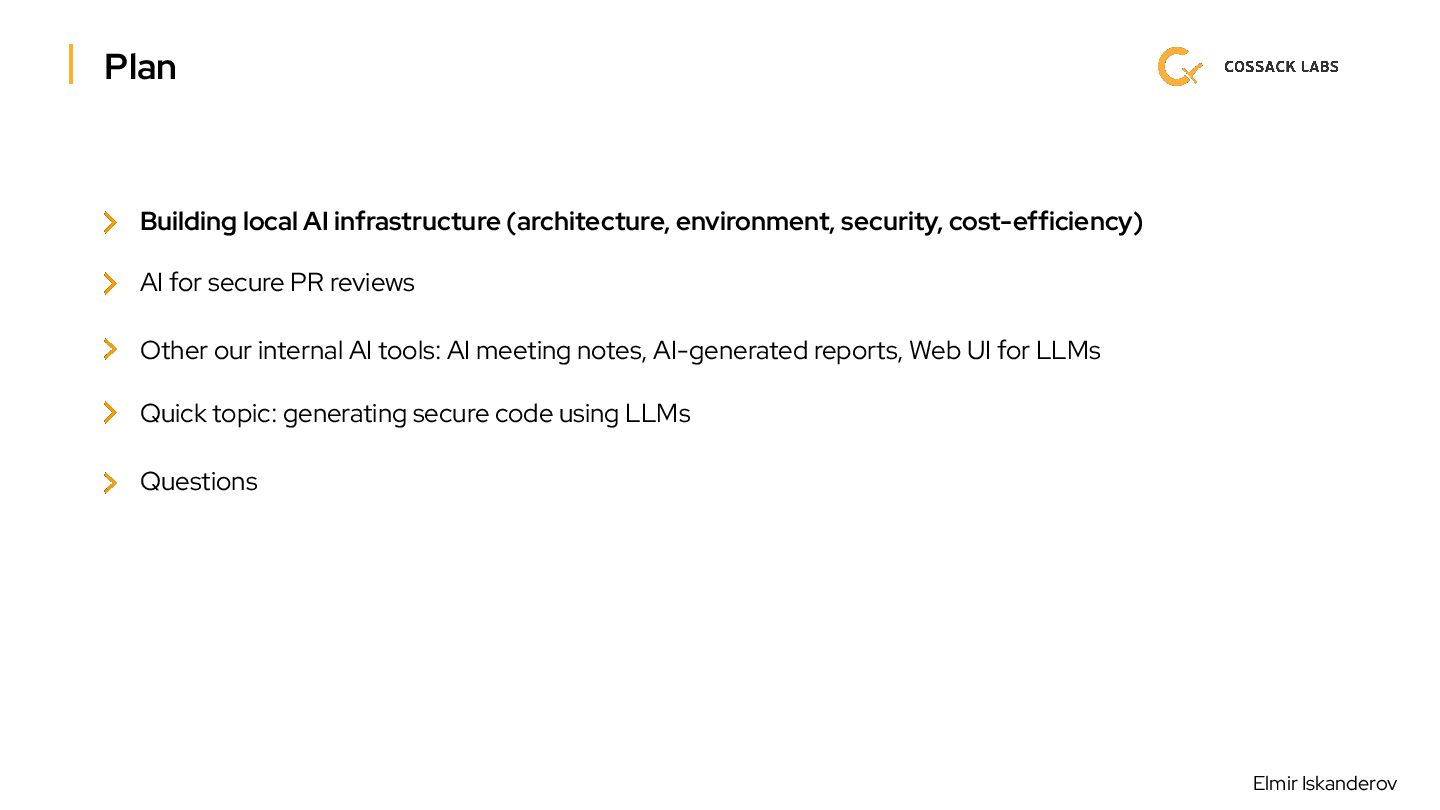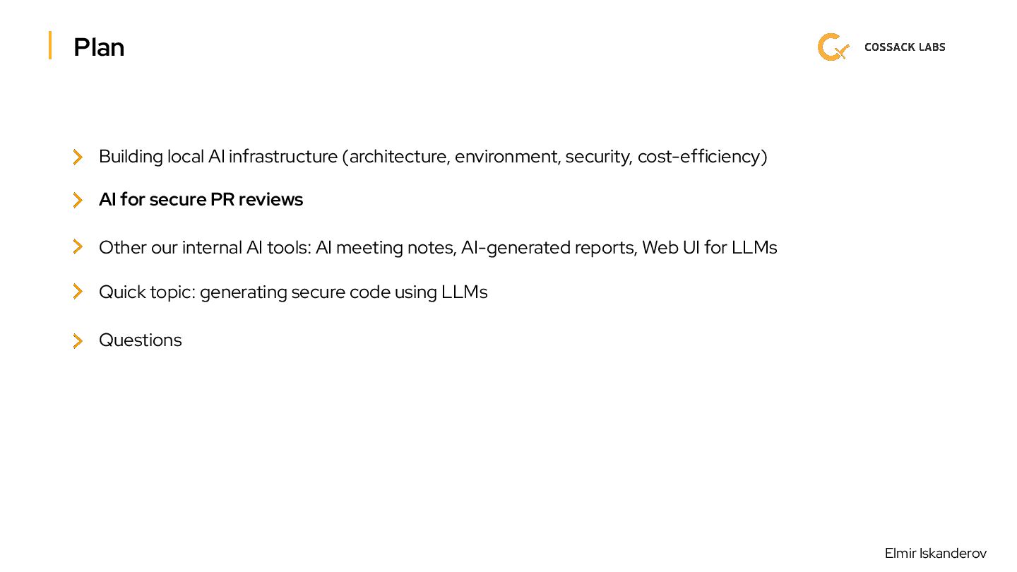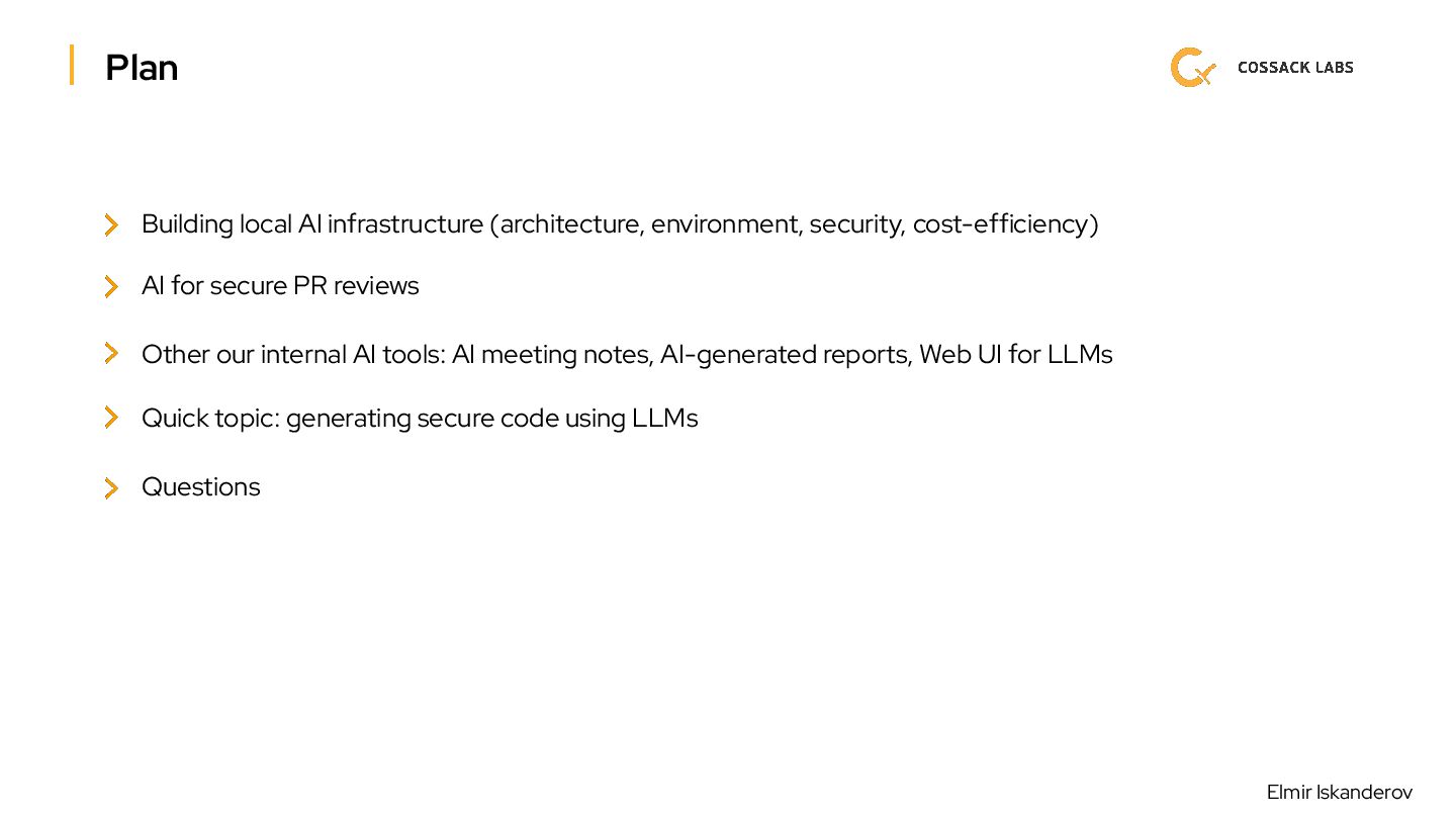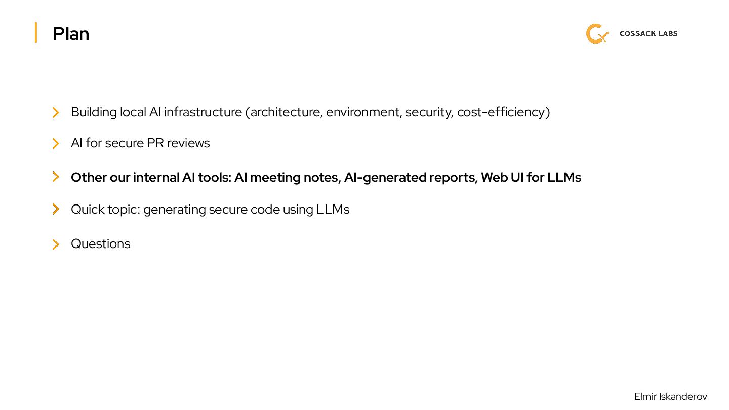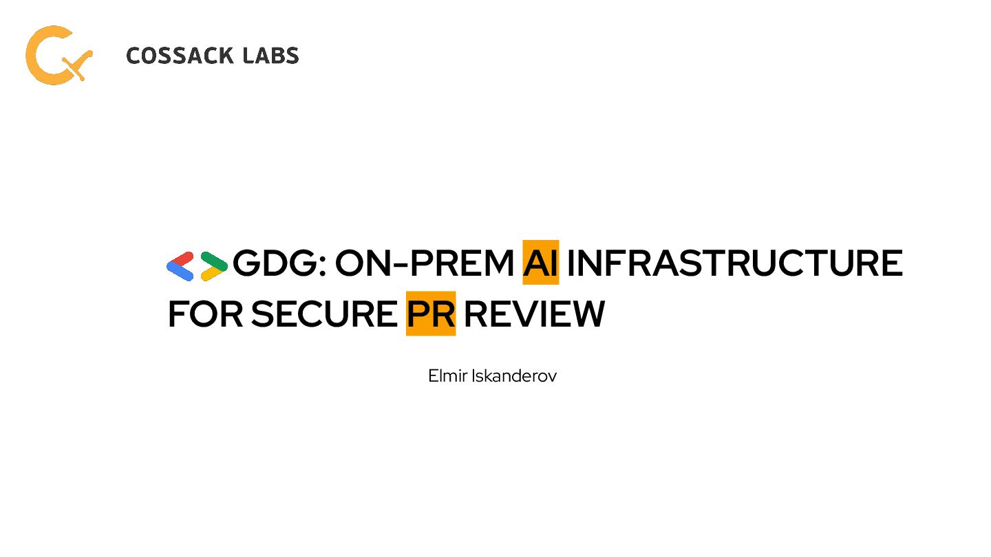 This presentation introduces the design of an on-prem AI infrastructure built for secure, private, and cost-efficient use of large language models within engineering teams . Using the Cossack Labs setup as an example, it demonstrates how local LLMs and Whisper ASR operate together with a controller server, GPU nodes, encrypted storage, and VPN-isolated services to support internal automation tools . A key focus is the AI-powered security pull-request review system, which automatically analyses diffs, detects security issues, and generates review comments using a structured LLM pipeline . The presentation also highlights additional internal AI tools, including AI meeting notes, draft vulnerability report generation, and a private web UI for interacting with LLMs.