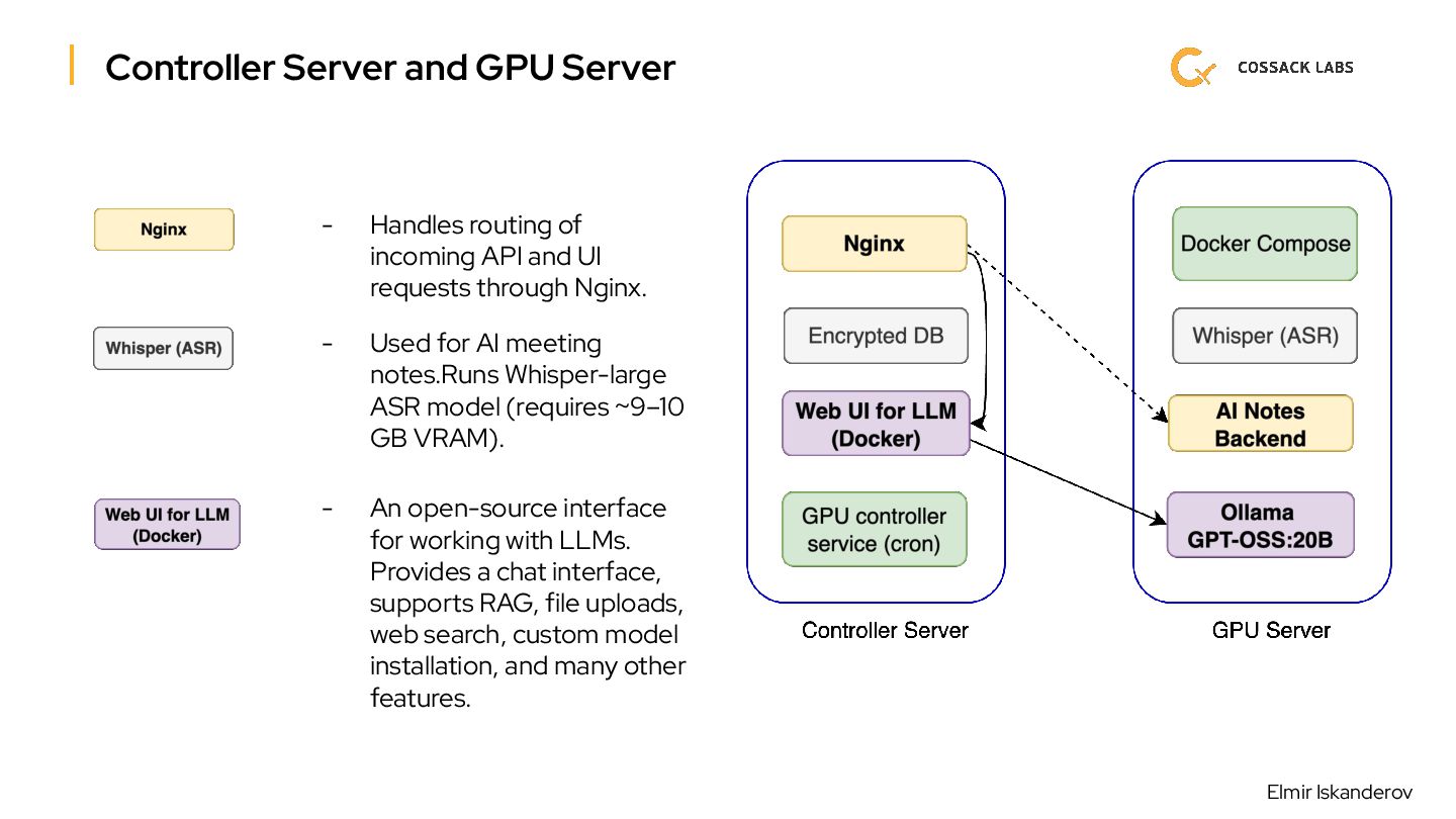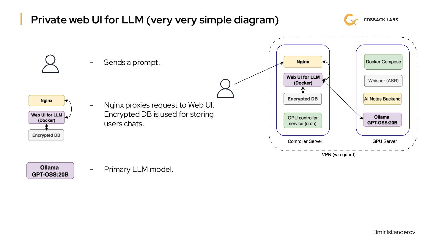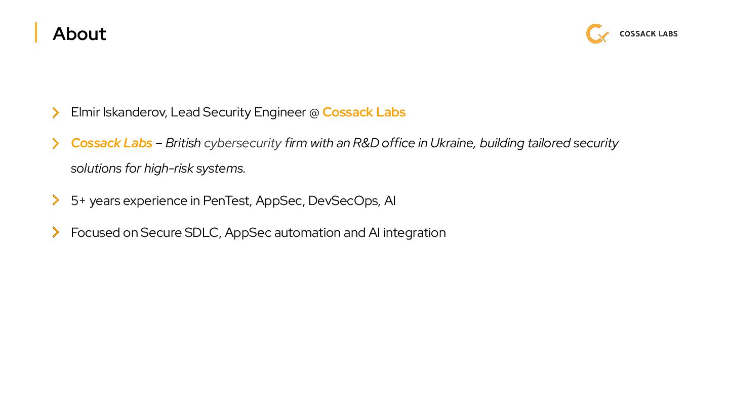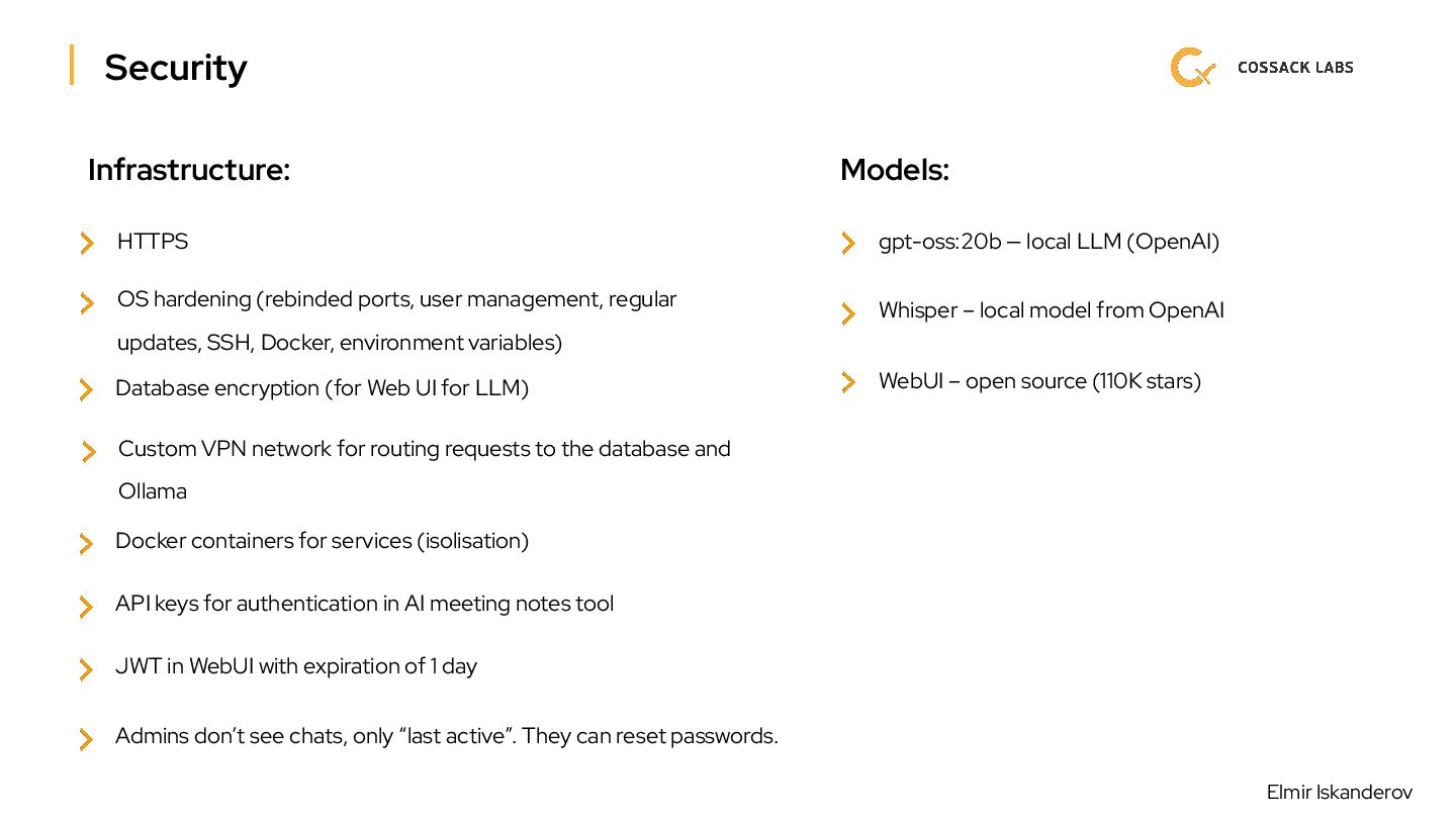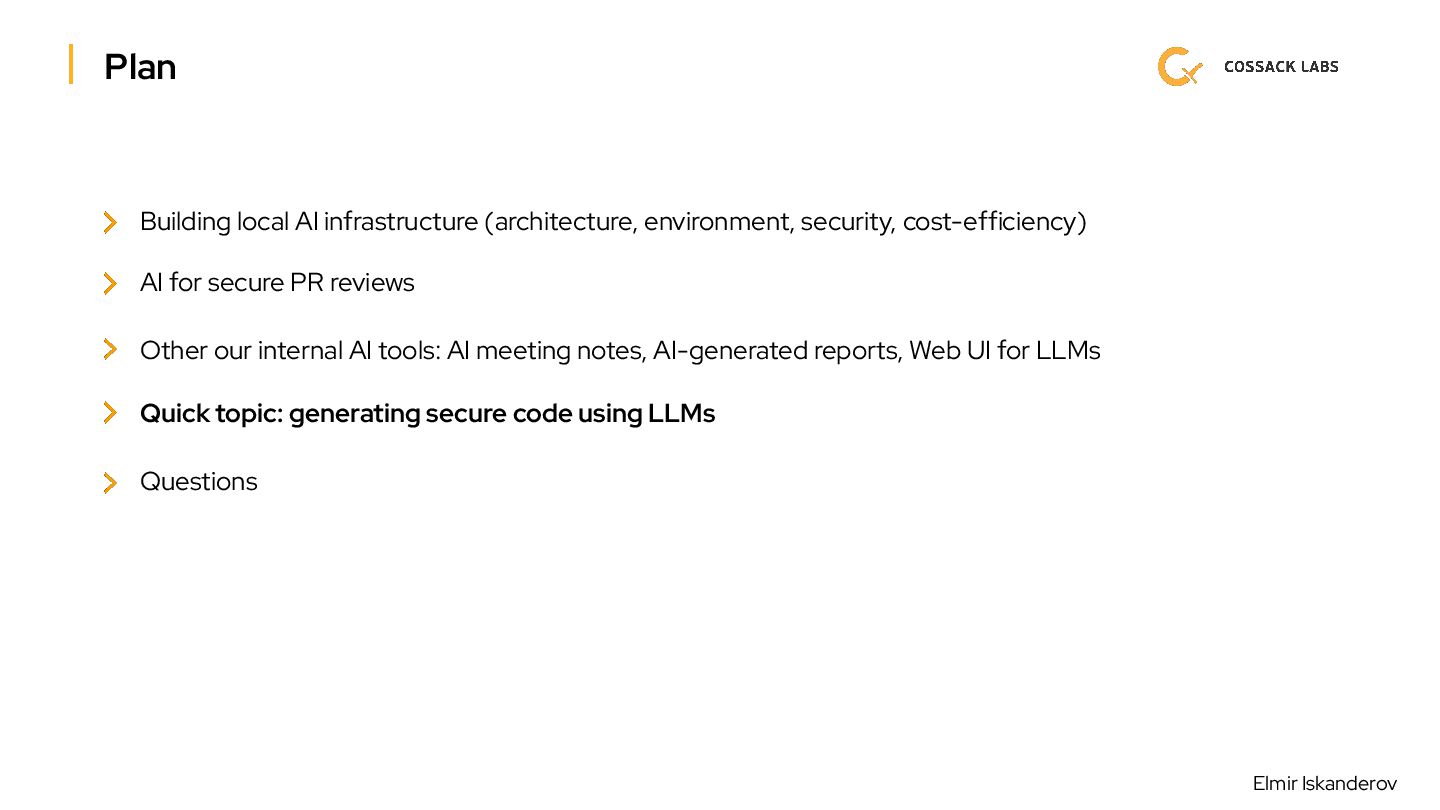 This presentation introduces the design of an on-prem AI infrastructure built for secure, private, and cost-efficient use of large language models within engineering teams . Using the Cossack Labs setup as an example, it demonstrates how local LLMs and Whisper ASR operate together with a controller server, GPU nodes, encrypted storage, and VPN-isolated services to support internal automation tools . A key focus is the AI-powered security pull-request review system, which automatically analyses diffs, detects security issues, and generates review comments using a structured LLM pipeline . The presentation also highlights additional internal AI tools, including AI meeting notes, draft vulnerability report generation, and a private web UI for interacting with LLMs.