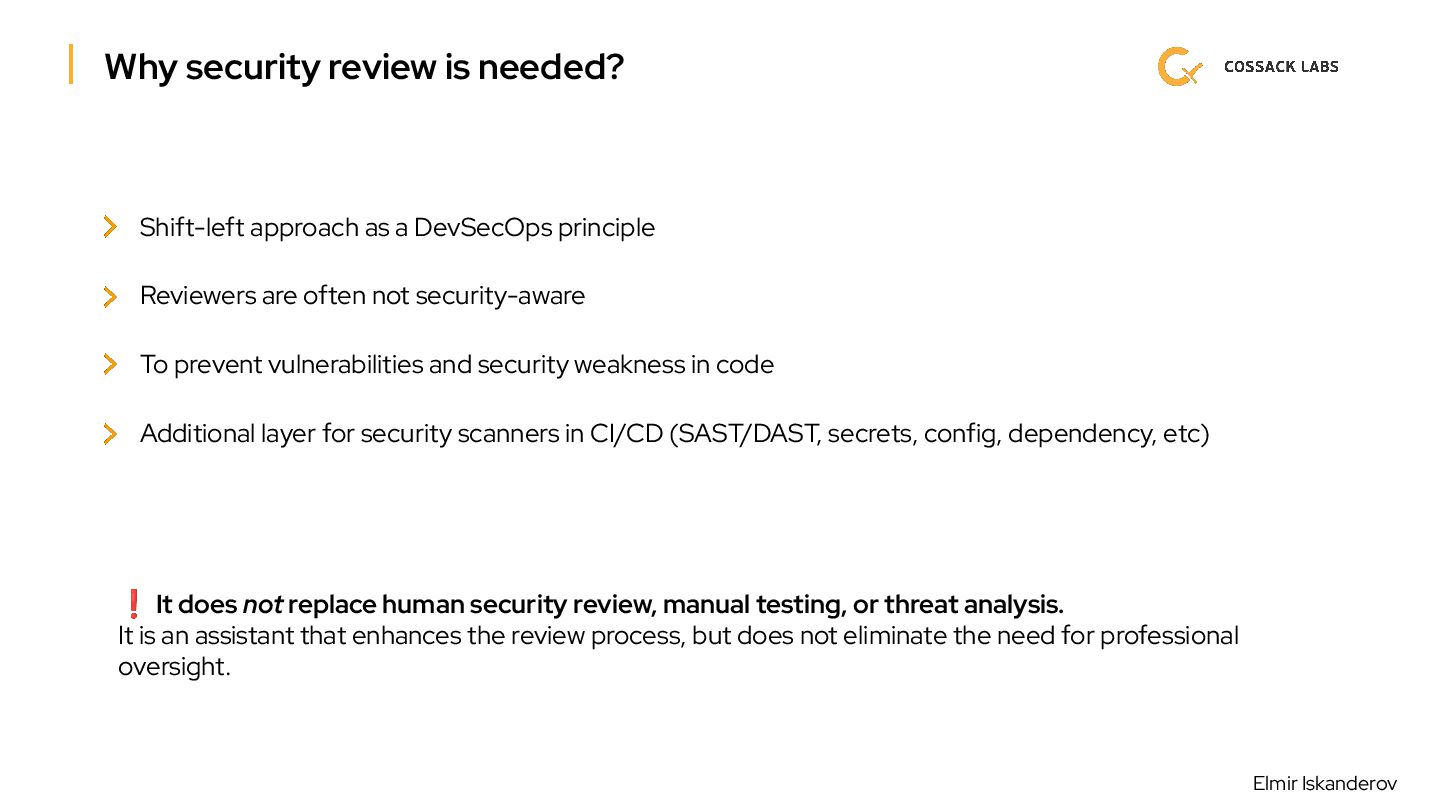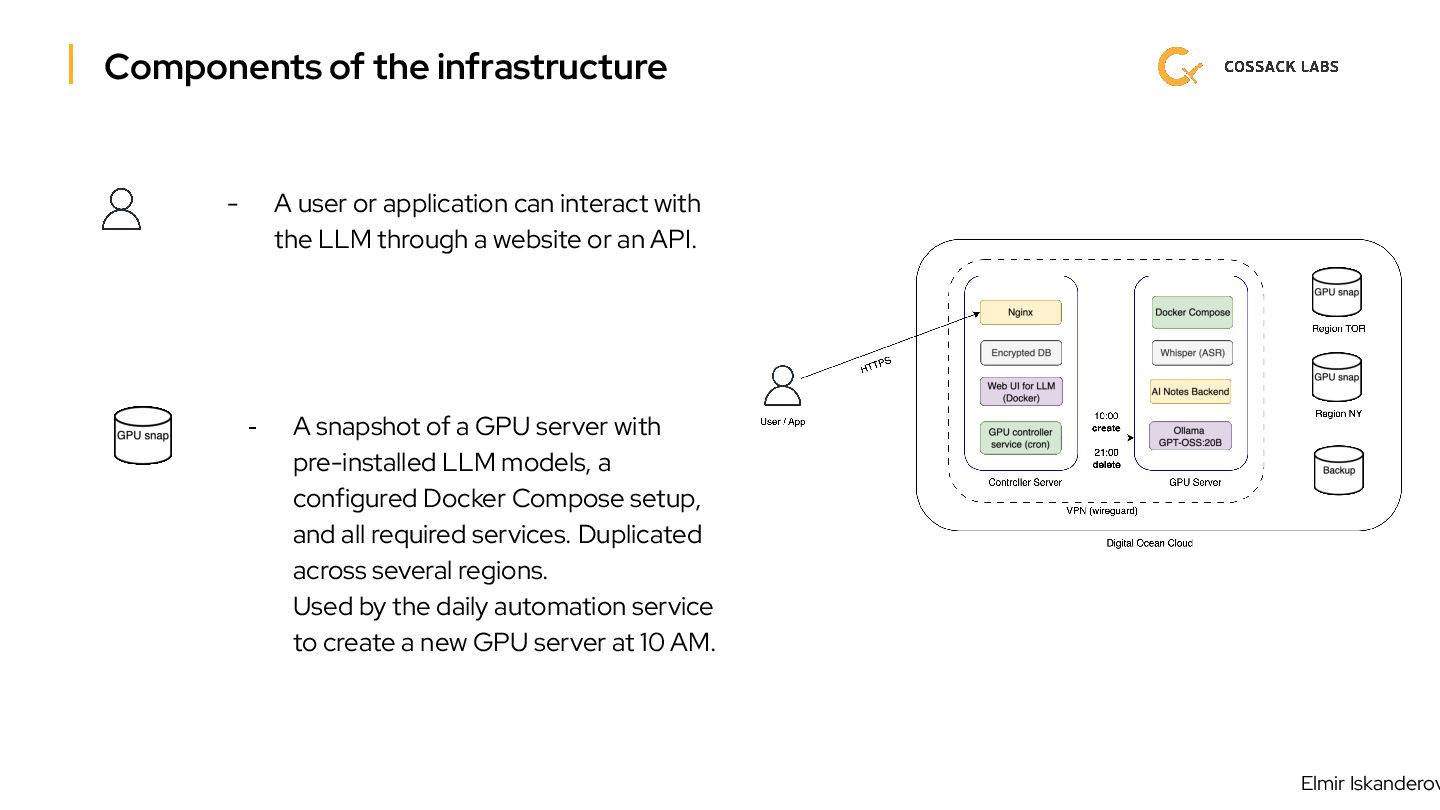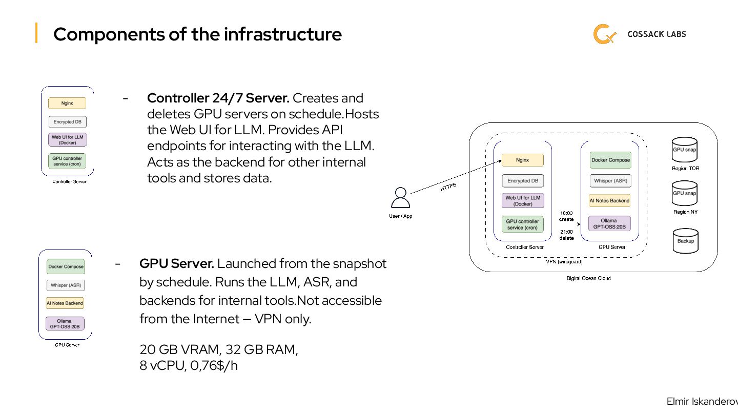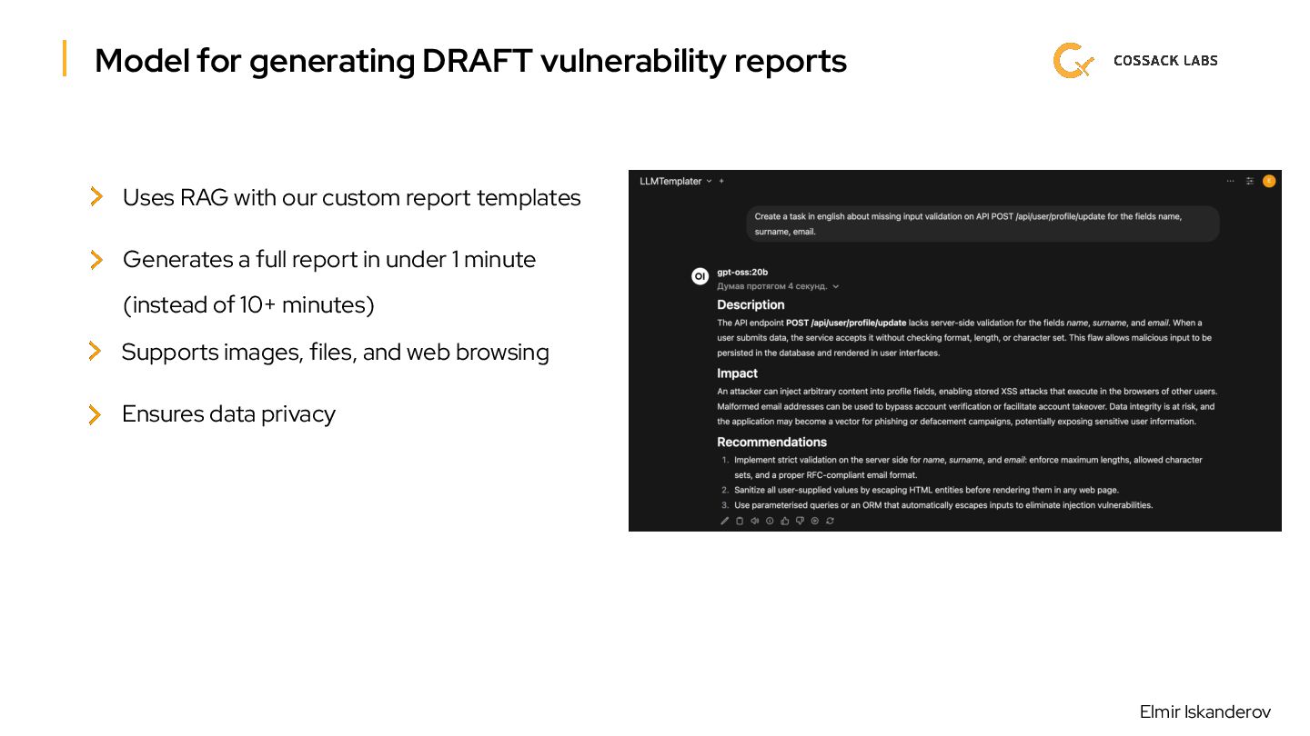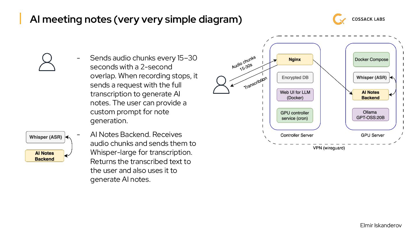This presentation introduces the design of an on-prem AI infrastructure built for secure, private, and cost-efficient use of large language models within engineering teams . Using the Cossack Labs setup as an example, it demonstrates how local LLMs and Whisper ASR operate together with a controller server, GPU nodes, encrypted storage, and VPN-isolated services to support internal automation tools . A key focus is the AI-powered security pull-request review system, which automatically analyses diffs, detects security issues, and generates review comments using a structured LLM pipeline . The presentation also highlights additional internal AI tools, including AI meeting notes, draft vulnerability report generation, and a private web UI for interacting with LLMs.