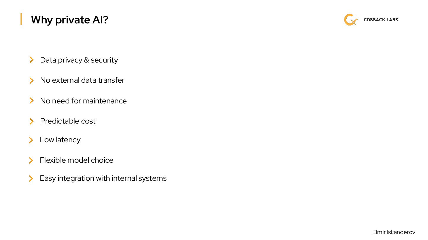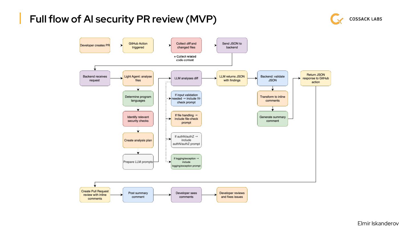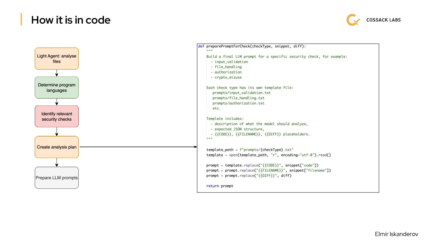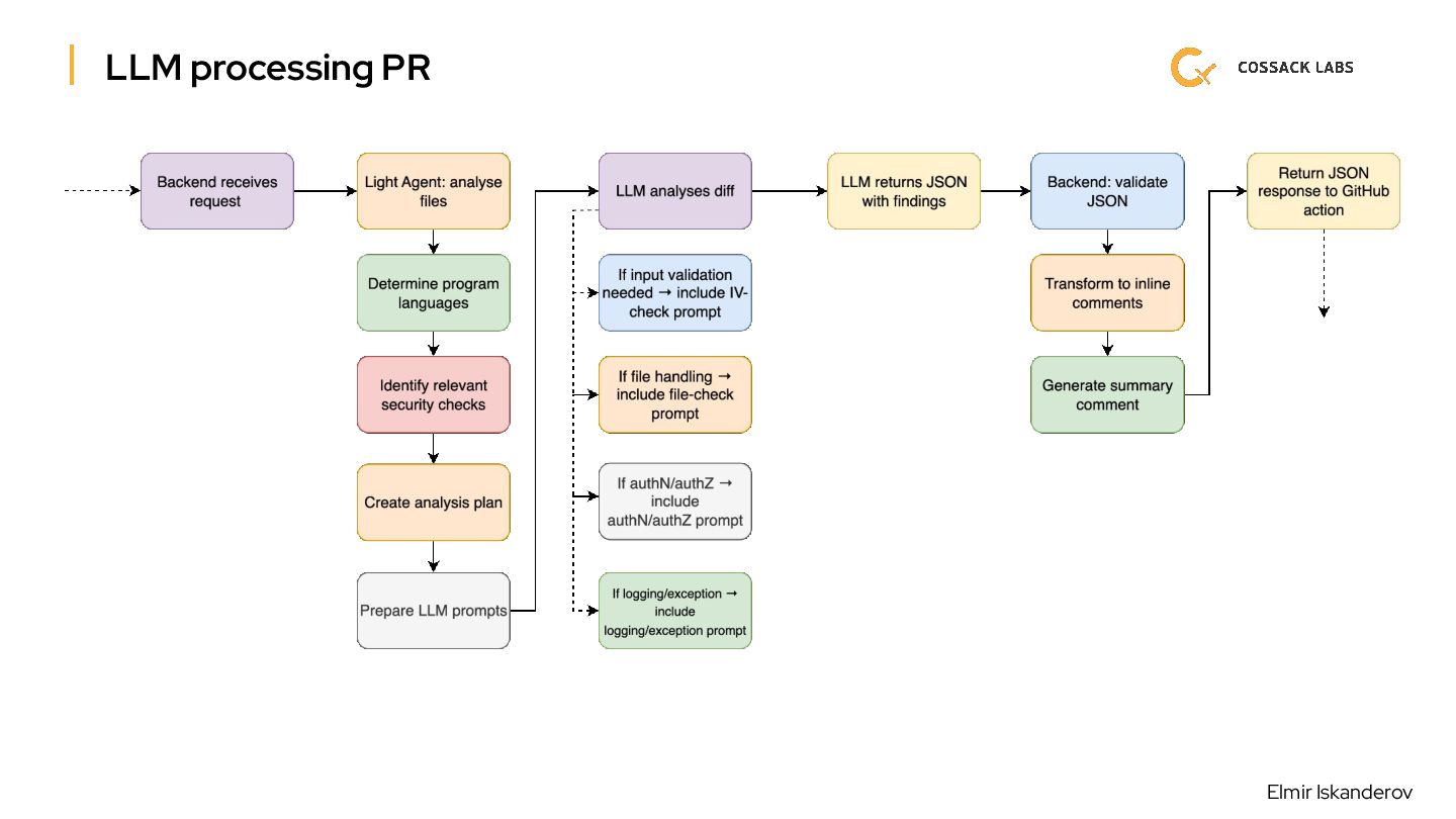 This presentation introduces the design of an on-prem AI infrastructure built for secure, private, and cost-efficient use of large language models within engineering teams . Using the Cossack Labs setup as an example, it demonstrates how local LLMs and Whisper ASR operate together with a controller server, GPU nodes, encrypted storage, and VPN-isolated services to support internal automation tools . A key focus is the AI-powered security pull-request review system, which automatically analyses diffs, detects security issues, and generates review comments using a structured LLM pipeline . The presentation also highlights additional internal AI tools, including AI meeting notes, draft vulnerability report generation, and a private web UI for interacting with LLMs.