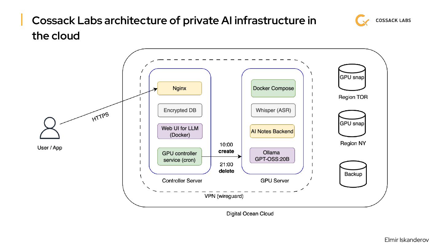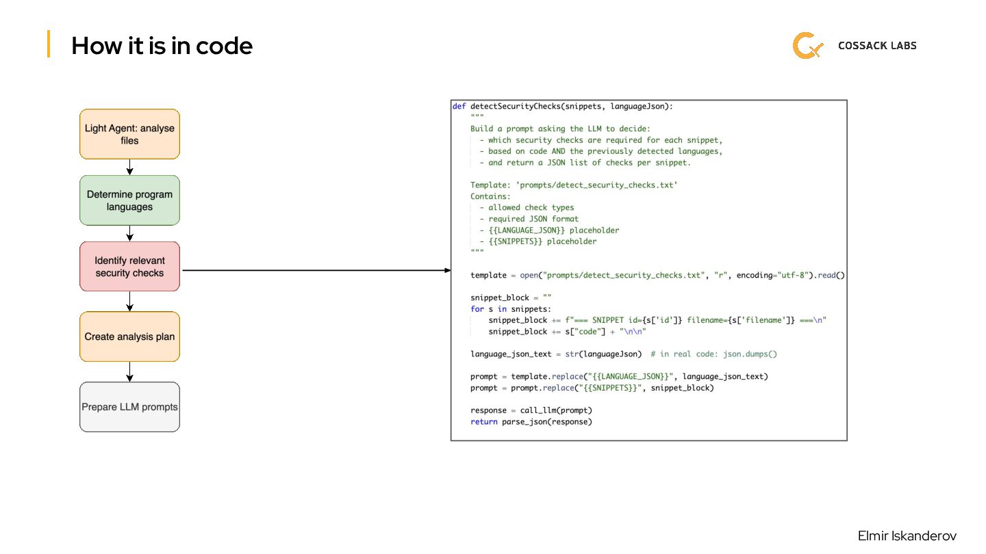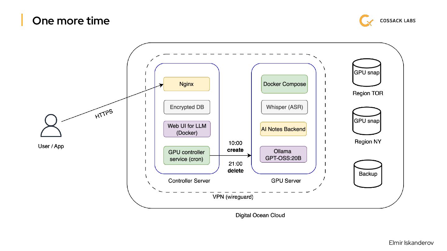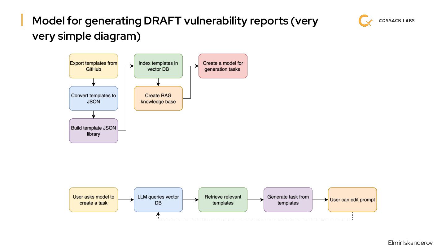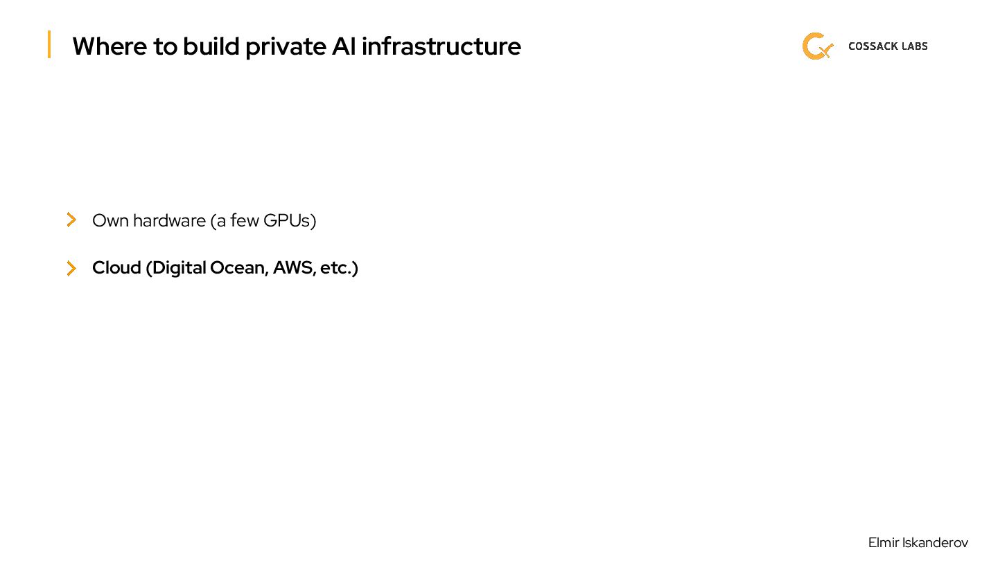 This presentation introduces the design of an on-prem AI infrastructure built for secure, private, and cost-efficient use of large language models within engineering teams . Using the Cossack Labs setup as an example, it demonstrates how local LLMs and Whisper ASR operate together with a controller server, GPU nodes, encrypted storage, and VPN-isolated services to support internal automation tools . A key focus is the AI-powered security pull-request review system, which automatically analyses diffs, detects security issues, and generates review comments using a structured LLM pipeline . The presentation also highlights additional internal AI tools, including AI meeting notes, draft vulnerability report generation, and a private web UI for interacting with LLMs.