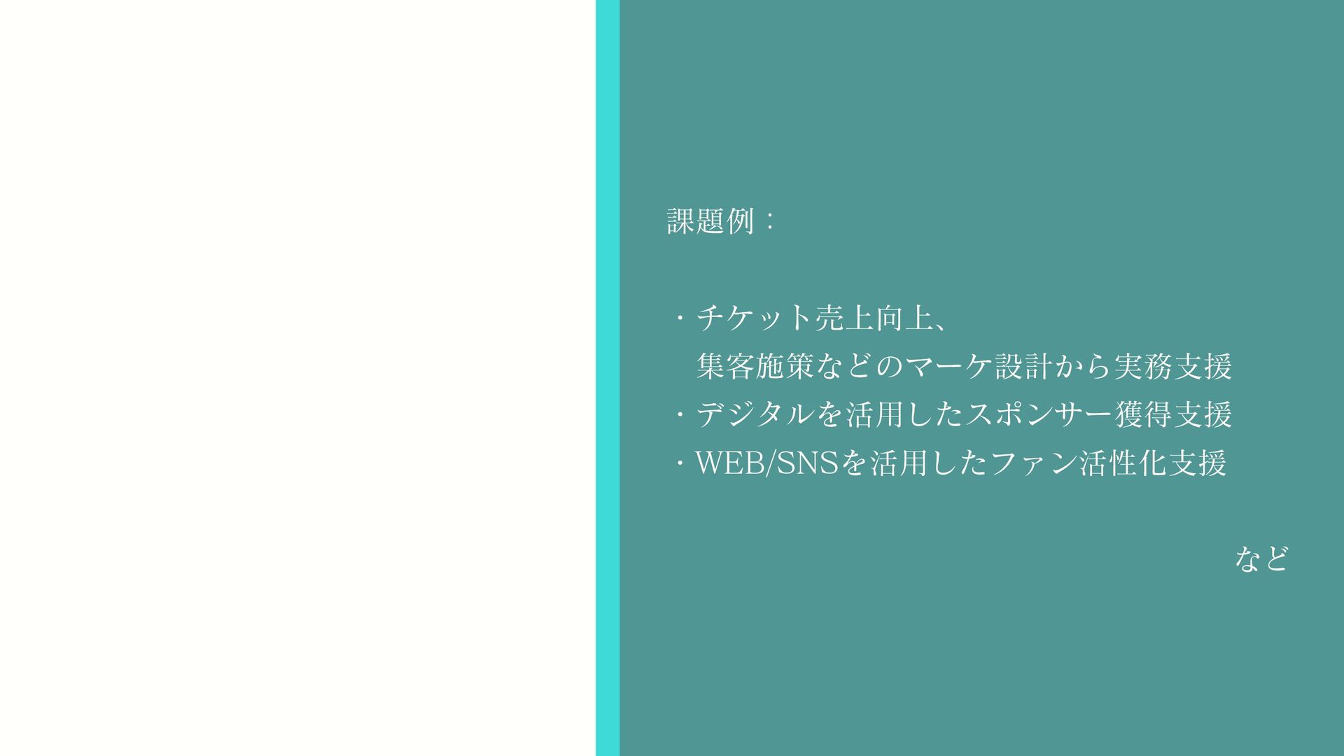 課題例: ・チケット売上向上、 集客施策などのマーケ設計から実務支援 ・デジタルを活用したスポンサー獲得支援 ・WEB/SNSを活用したファン活性化支援 など