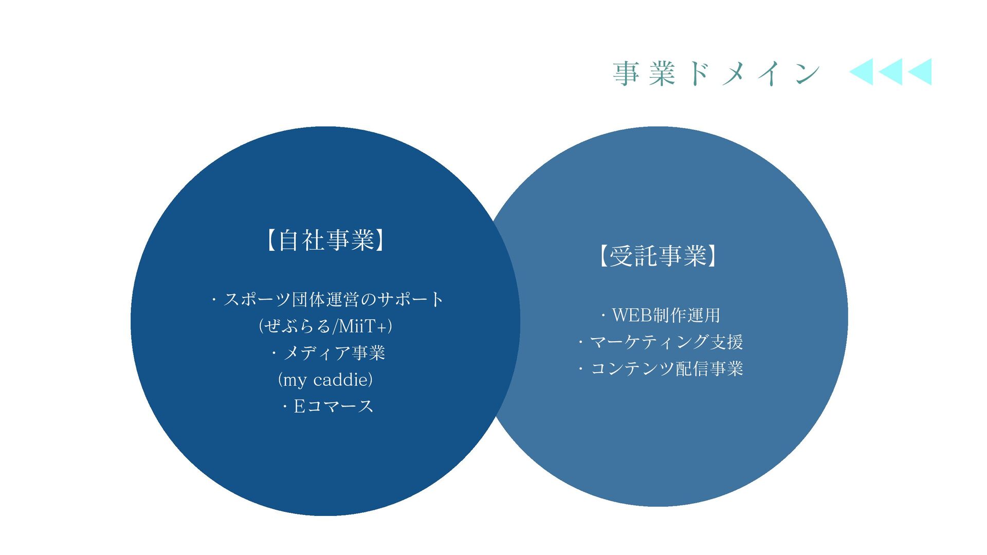 【自社事業】 ・スポーツ団体運営のサポート (ぜぶらる/MiiT+) ・メディア事業 (my caddie) ・Eコマース 【受託事業】 ・WEB制作運用 ・マーケティング支援
