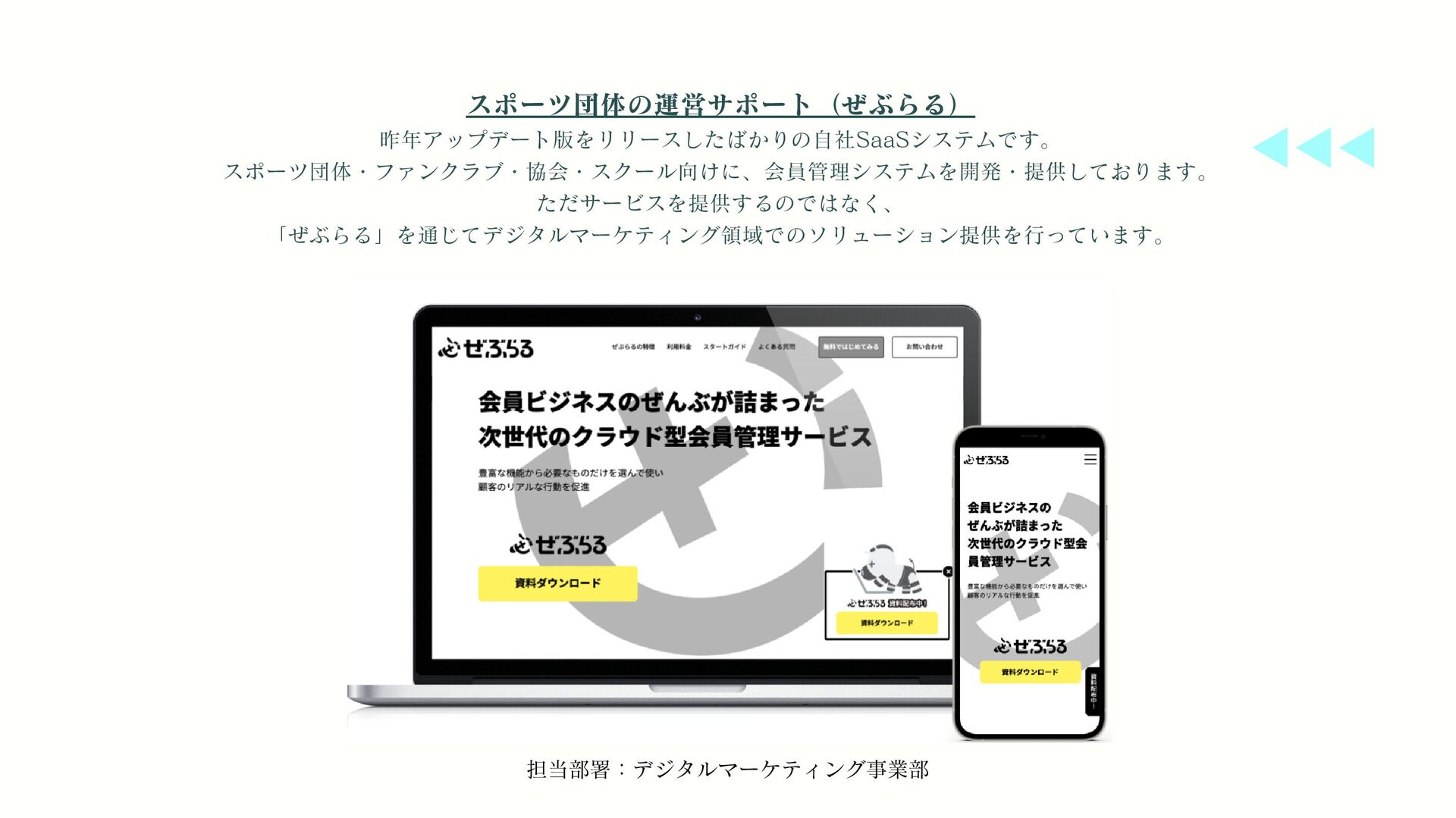 スポーツ団体の運営サポート(ぜぶらる) 昨年アップデート版をリリースしたばかりの自社SaaSシステムです。 スポーツ団体・ファンクラブ・協会・スクール向けに、会員管理システムを開発・提供しております。 ただサービスを提供するのではなく、 「ぜぶらる」を通じてデジタルマーケティング領域でのソリューション提供を行っています。 担当部署:デジタルマーケティング事業部