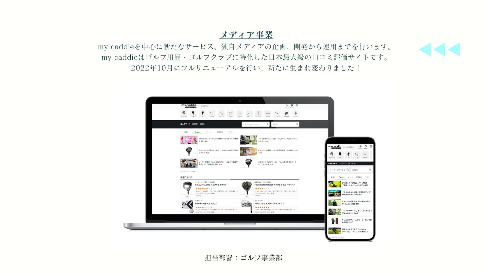 メディア事業 my caddieを中心に新たなサービス、独自メディアの企画、開発から運用までを行います。 my caddieはゴルフ用品・ゴルフクラブに特化した日本最大級の口コミ評価サイトです。 2022年10月にフルリニューアルを行い、新たに生まれ変わりました! 担当部署:ゴルフ事業部