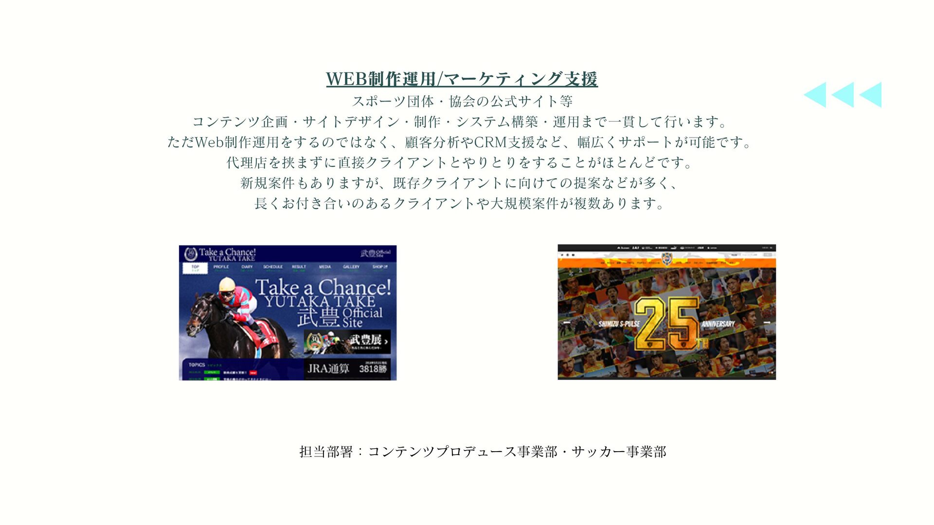 WEB制作運用/マーケティング支援 スポーツ団体・協会の公式サイト等 コンテンツ企画・サイトデザイン・制作・システム構築・運用まで一貫して行います。 ただWeb制作運用をするのではなく、顧客分析やCRM支援など、幅広くサポートが可能です。 代理店を挟まずに直接クライアントとやりとりをすることがほとんどです。 新規案件もありますが、既存クライアントに向けての提案などが多く、 長くお付き合いのあるクライアントや大規模案件が複数あります。 担当部署:コンテンツプロデュース事業部・サッカー事業部
