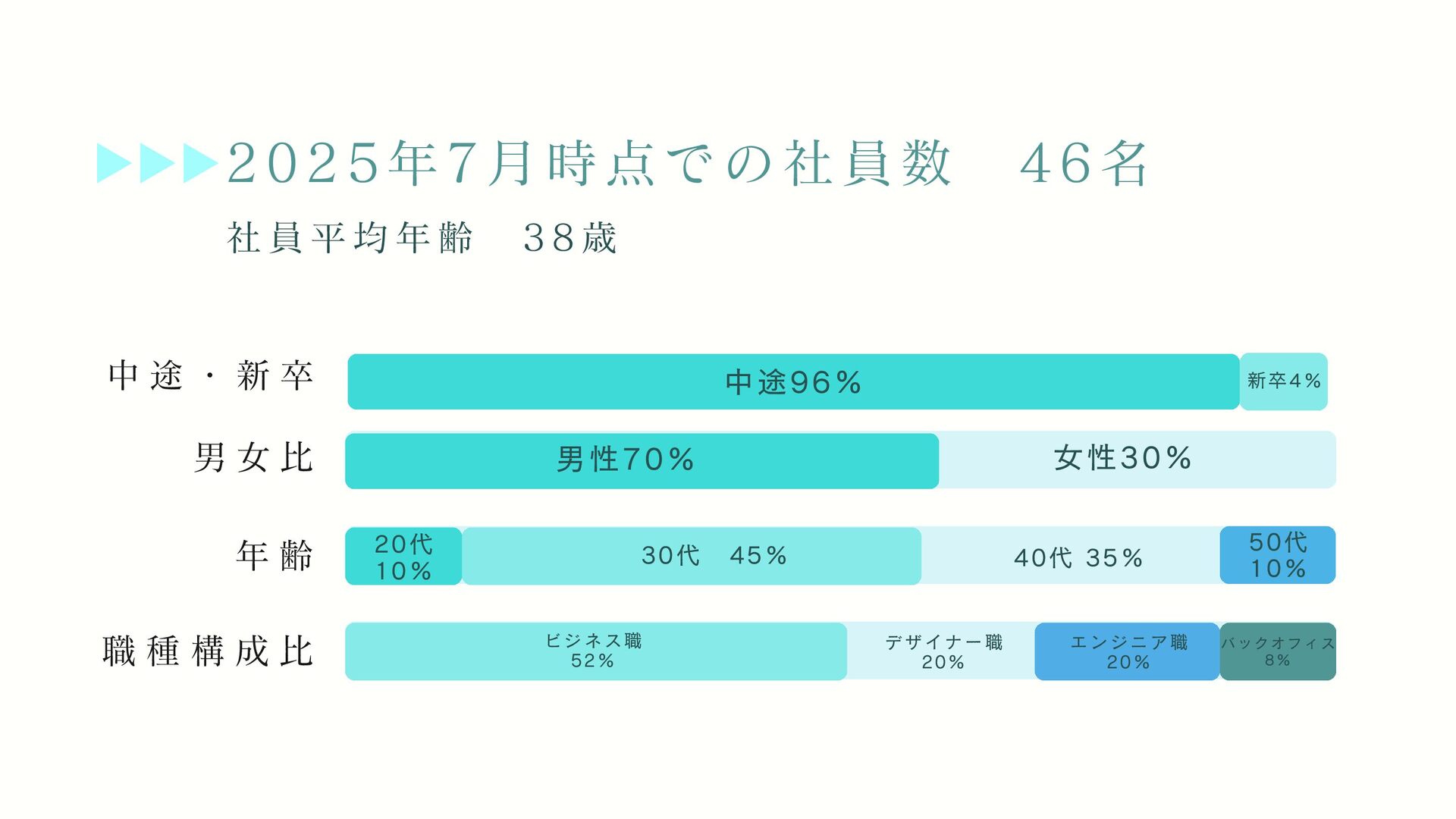種 構 成 比 男性70% 女性30% 20代 10% 30代 45% 40代 35% 社 員 平 均 年 齢 3 8 歳 2025年7月時点での社員数 46名 ビジネス職 52% バックオフィス 8% 中 途 ・ 新 卒 中途96% 新卒4% 50代 10%