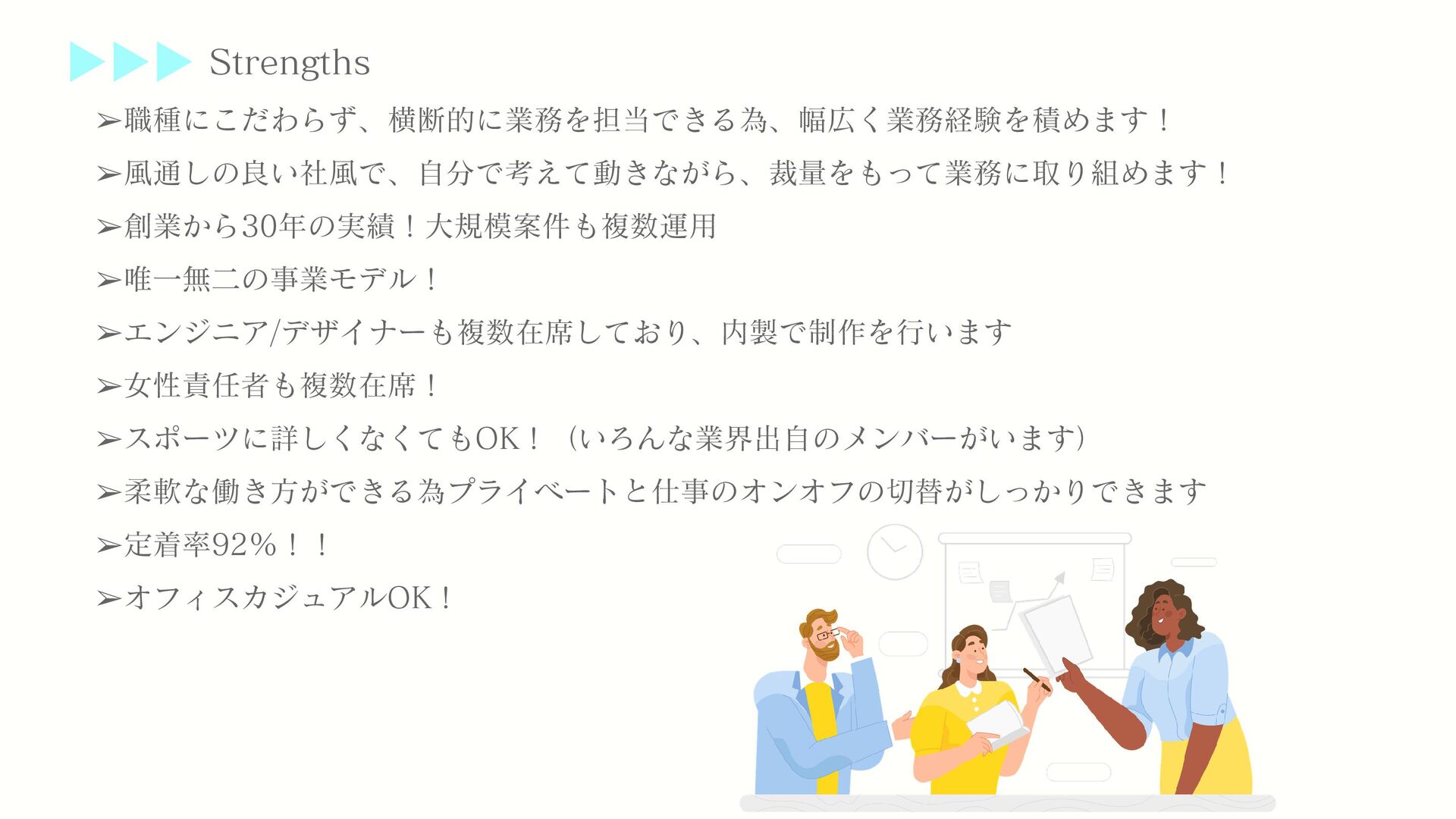 ➢職種にこだわらず、横断的に業務を担当できる為、幅広く業務経験を積めます! ➢風通しの良い社風で、自分で考えて動きながら、裁量をもって業務に取り組めます! ➢創業から30年の実績!大規模案件も複数運用 ➢唯一無二の事業モデル! ➢エンジニア/デザイナーも複数在席しており、内製で制作を行います ➢女性責任者も複数在席! ➢スポーツに詳しくなくてもOK!(いろんな業界出自のメンバーがいます) ➢柔軟な働き方ができる為プライベートと仕事のオンオフの切替がしっかりできます ➢定着率92%!! ➢オフィスカジュアルOK!