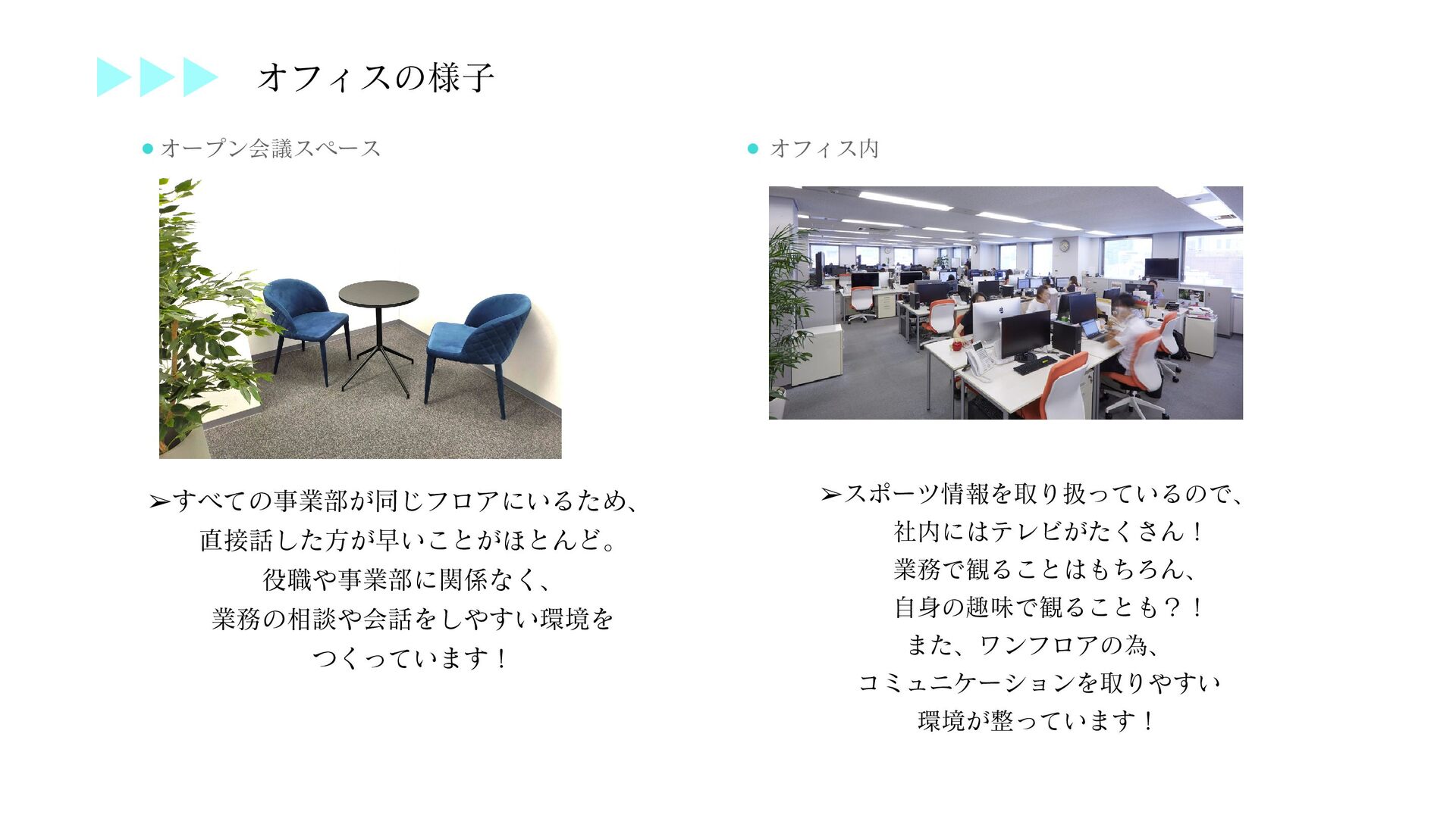 ➢スポーツ情報を取り扱っているので、 社内にはテレビがたくさん! 業務で観ることはもちろん、 自身の趣味で観ることも?! また、ワンフロアの為、 コミュニケーションを取りやすい 環境が整っています!