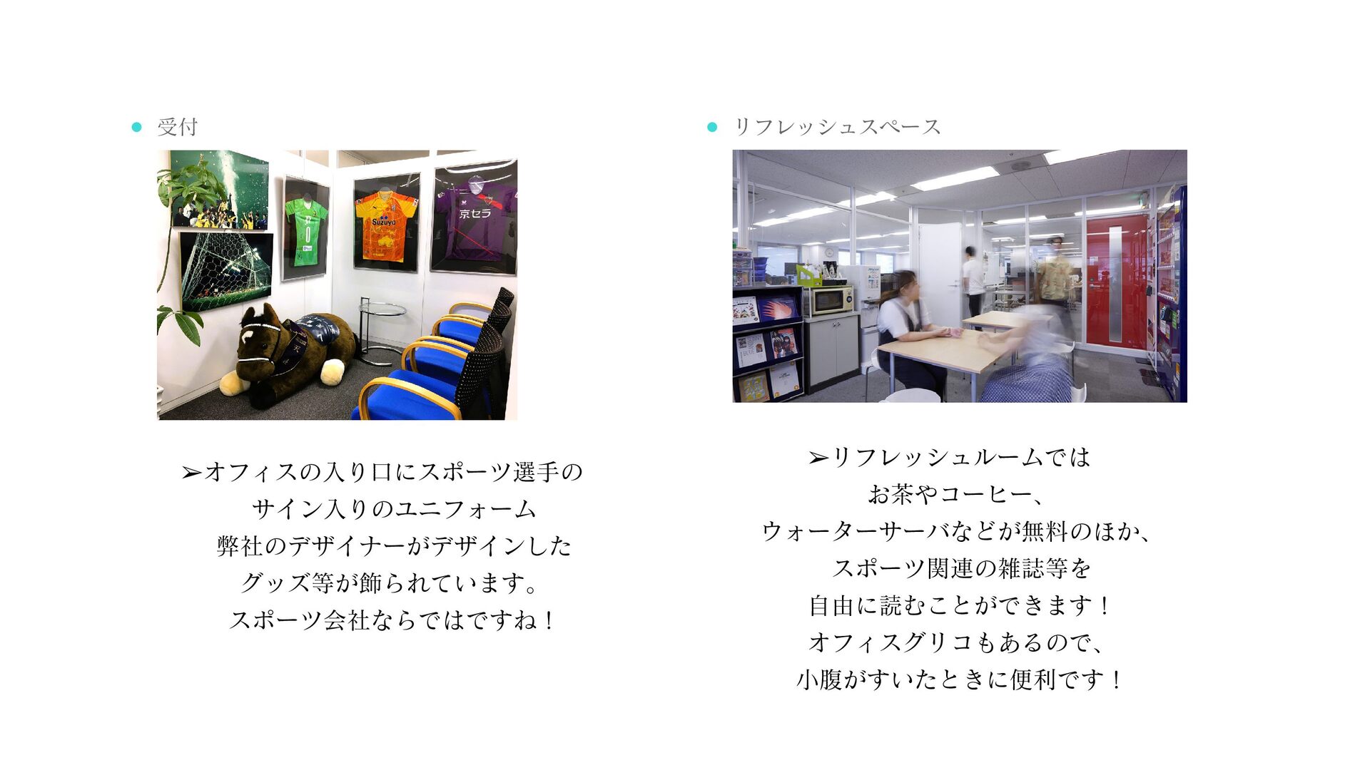 ・受付 リフレッシュスペース ・ ➢オフィスの入り口にスポーツ選手の サイン入りのユニフォーム 弊社のデザイナーがデザインした グッズ等が飾られています。 スポーツ会社ならではですね! ➢リフレッシュルームでは お茶やコーヒー、