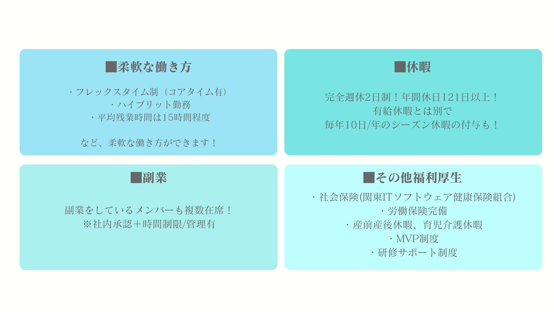 毎年10日/年のシーズン休暇の付与も! 副業をしているメンバーも複数在席! ※社内承認+時間制限/管理有 ・社会保険(関東ITソフトウェア健康保険組合) ・労働保険完備 ・産前産後休暇、育児介護休暇 ・MVP制度 ・研修サポート制度