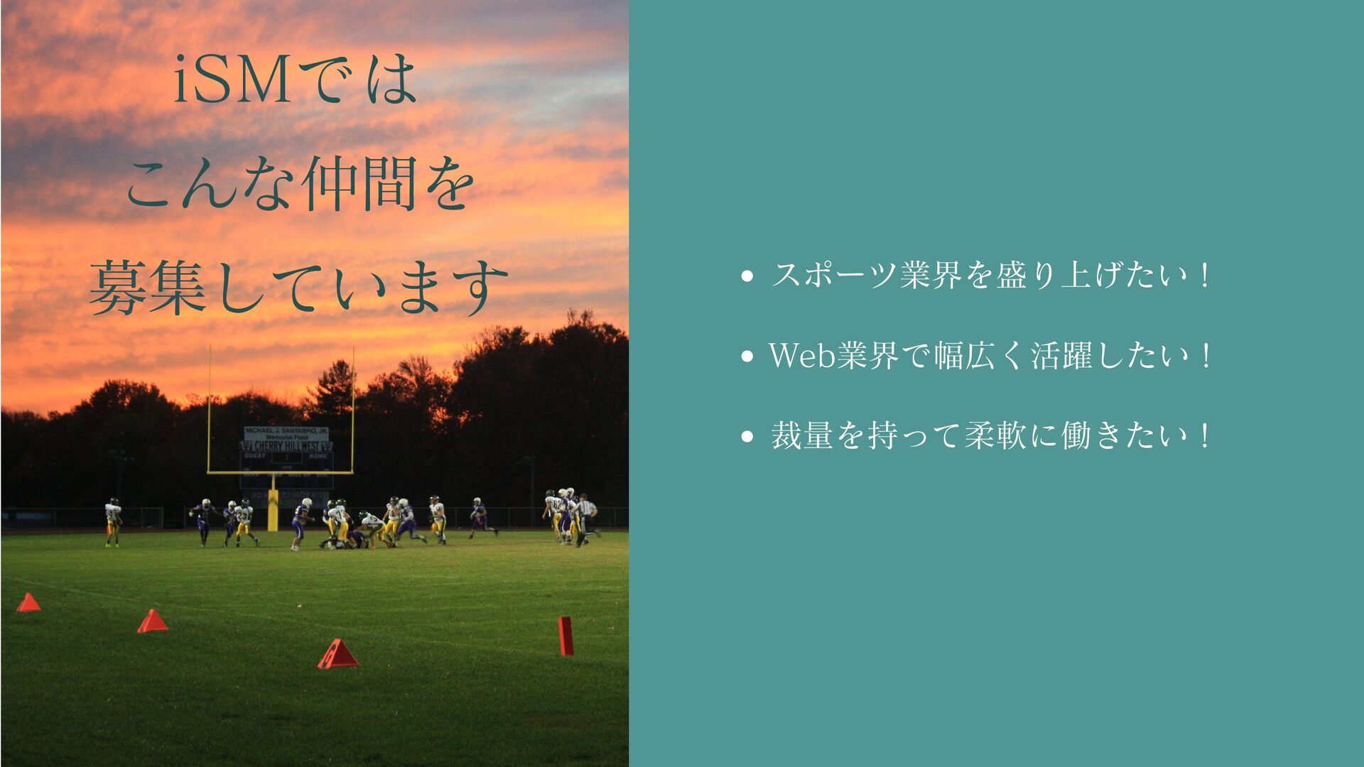 iSMでは こんな仲間を 募集しています スポーツ業界を盛り上げたい! Web業界で幅広く活躍したい! 裁量を持って柔軟に働きたい!